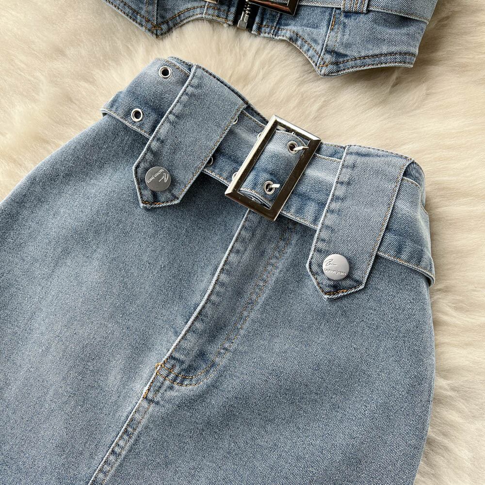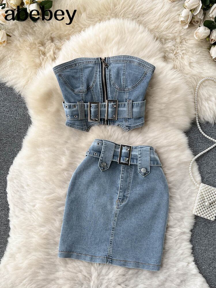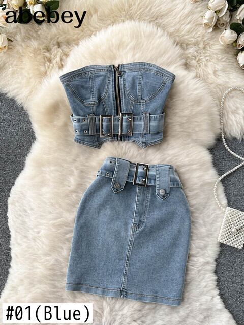 夏の女性2つの2ピースセットセクシーなストラップレスジーンズベスト+ウエストボタンアップデニムスカートオフィスレディノースリーブスーツ サマー 夏物 会社 学校 通勤や通学にも Abe64186467947