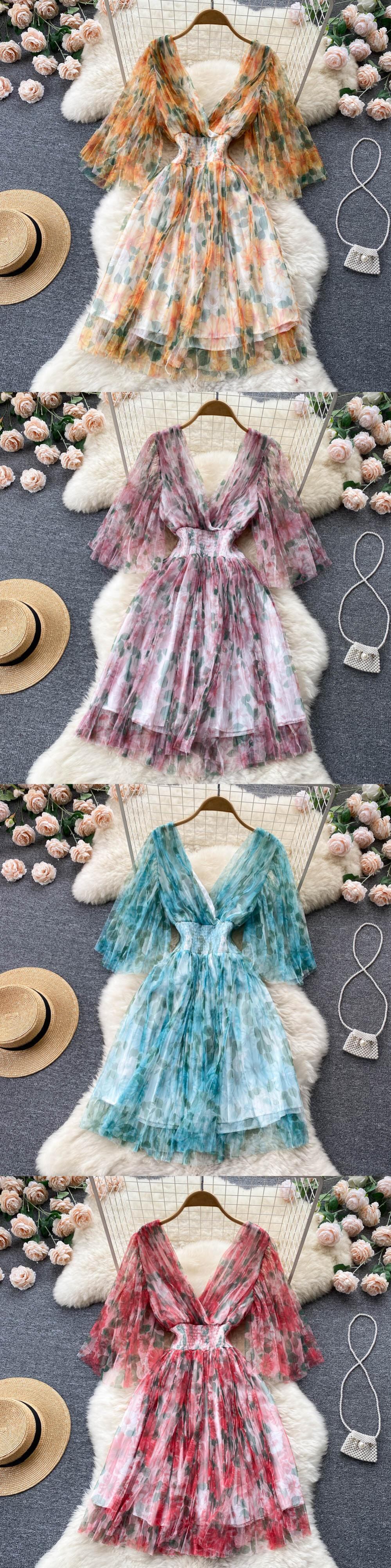 夏の女性フローラルメッシュミディドレスヴィンテージディープVネックウエストプリーツベスティドレッド/ピンク/ブラックローブの衣装 サマー 夏物 花柄 ビンテージ Abe23544985167