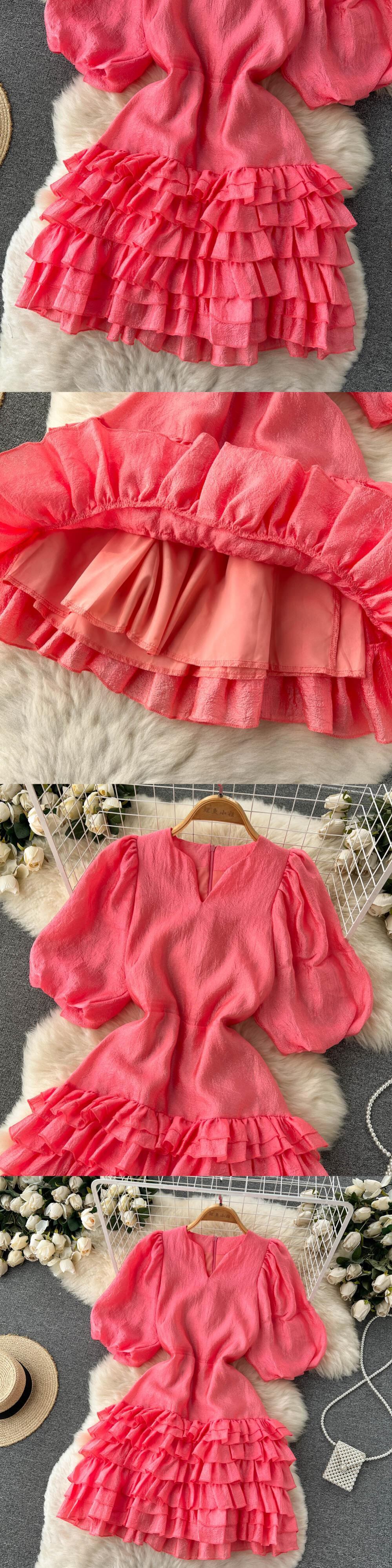 グリーン/ピンクシックミディドレスレディースソリッドフリルパフスリーブドレス2022ヴィンテージフリルVestidos ラッフル ソリッドカラー ビンテージ Abe99062516116