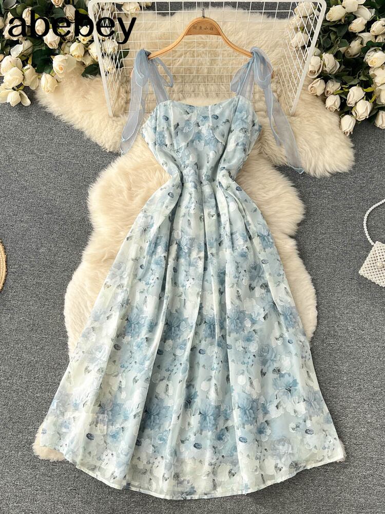 夏のレディースドレスフレンチレトロスクエアネックプリントサスペンダードレスウエストレースフェムルショートドレス サマー 夏物 スクウェア Abe18954571228