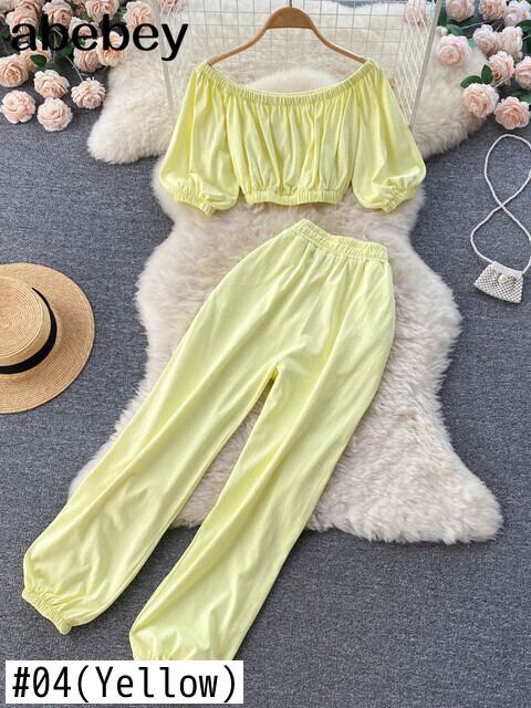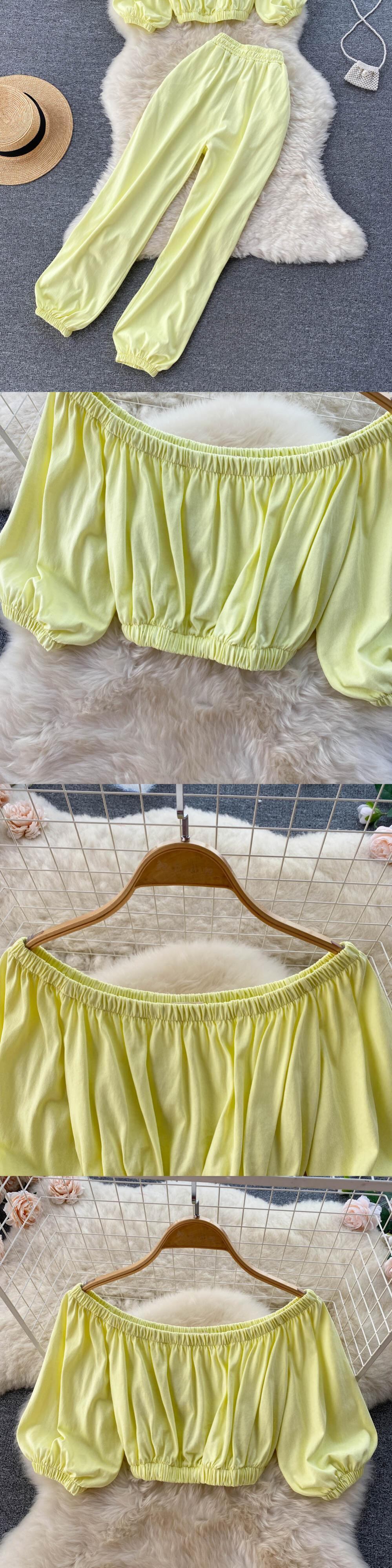 女性パンツセットボディコンスリムスラッシュネックトップ+ワイドレッグロングパンツソリッドサマーツーピーススーツ 夏物 ワイドパンツ ソリッドカラー Abe41054703966