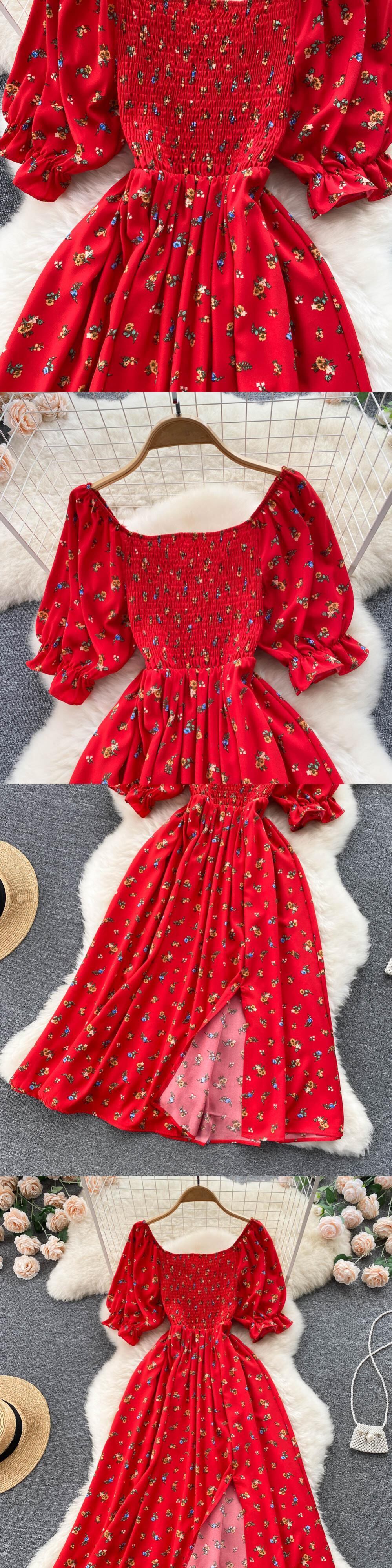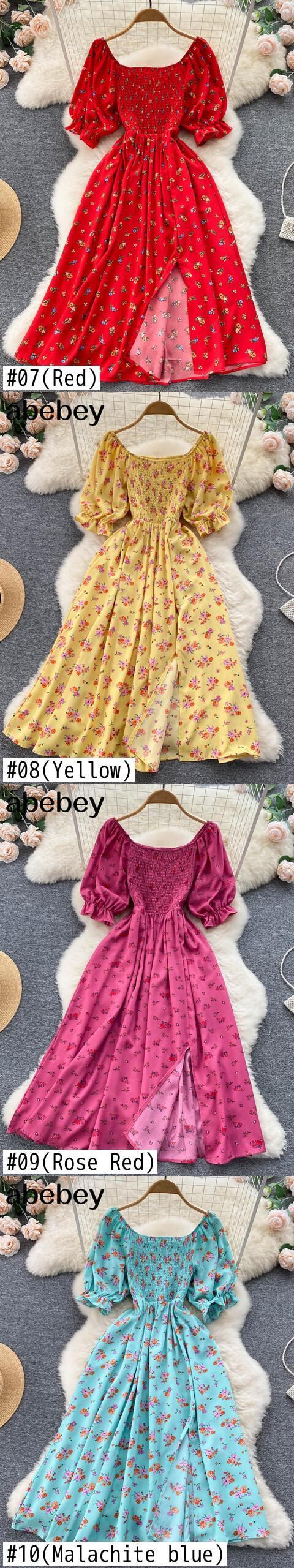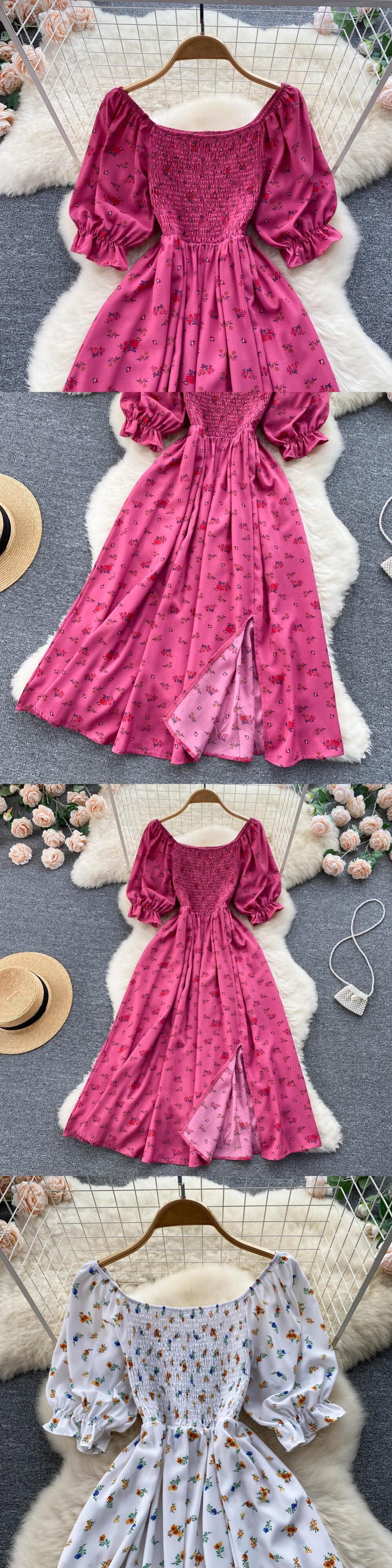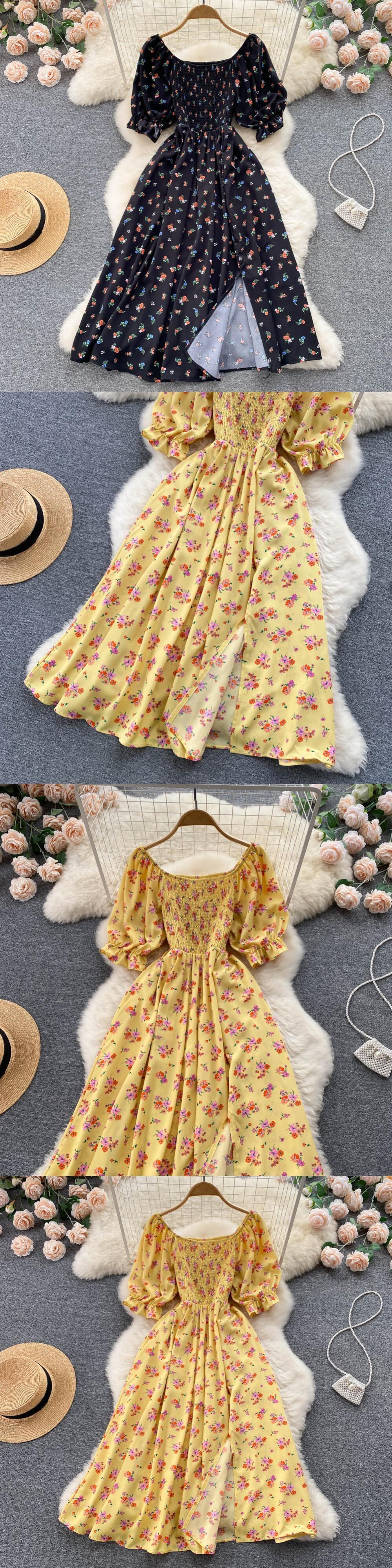 ショートパフスリーブFlroalプリントシャーリングパーティースプリット女性サマードレスロングマキシドレス巾着セクシーVestidosサンドレス 夏物 Abe87278330549