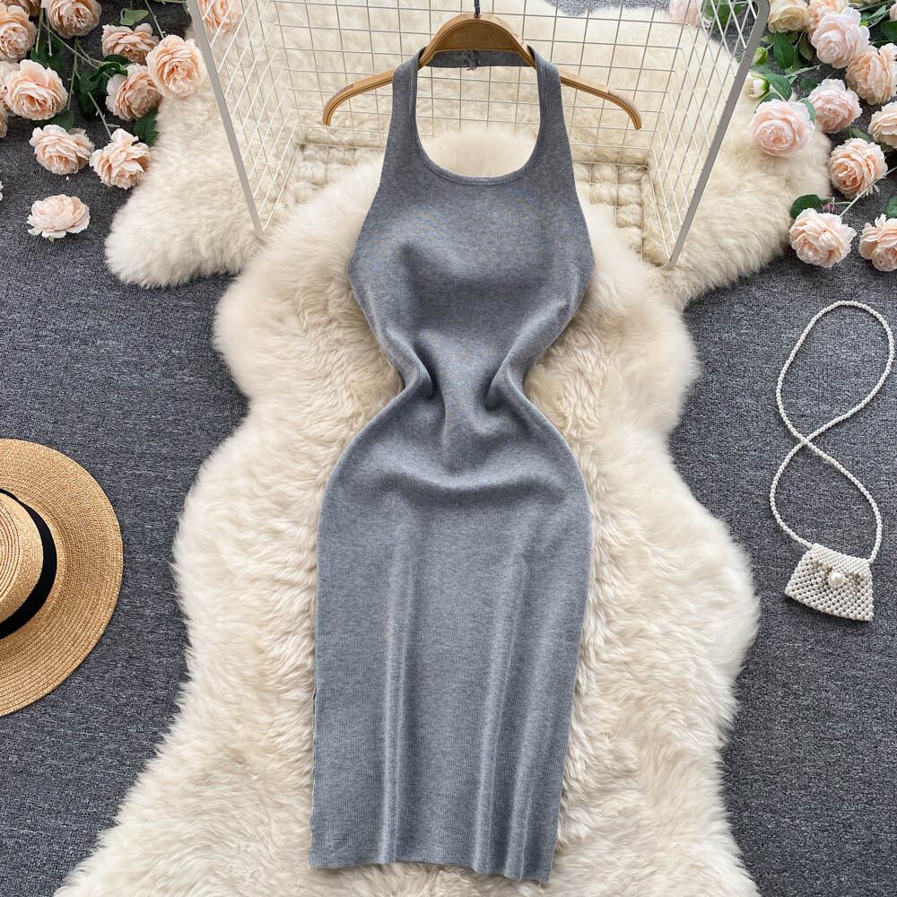 ピンク/ブラックホルターソリッドニットドレスオールマッチシンプルな女性のドレスVestidosスリット服 ソリッドカラー Abe1640917183