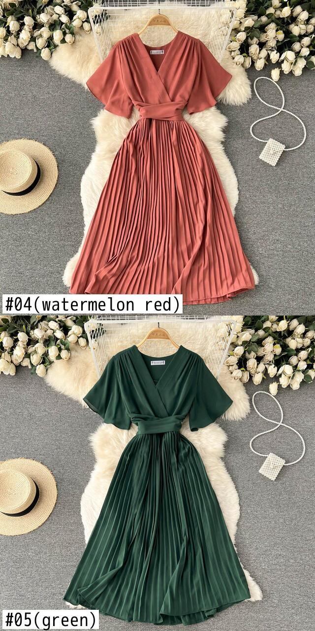 フレンチプリーツドレスレディース半袖VネックソリッドAラインドレス2022サマーシフォンバケーションビーチサンドレス ショート ハーフスリーブ 夏物 ソリッドカラー Abe37007733413