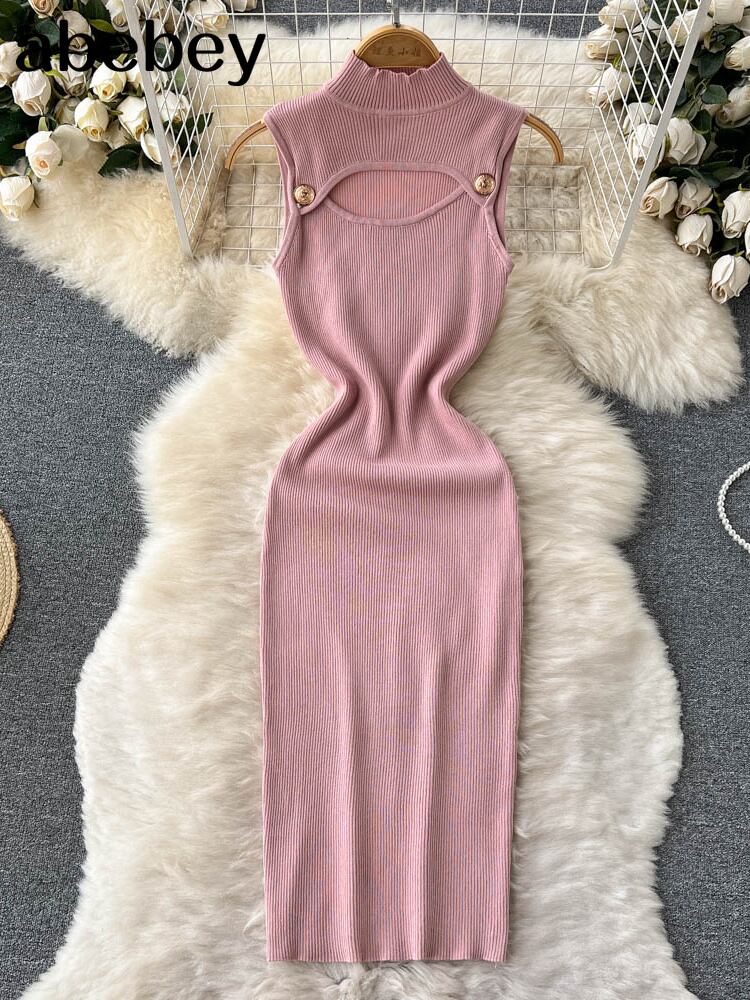 2022セクシーな女性のニットペンシルドレス中空アウトノースリーブ弾性スリムシースドレス夏のシックなストリートウェアミディドレス エラスティック 伸縮 サマー 夏物 Abe95308111918