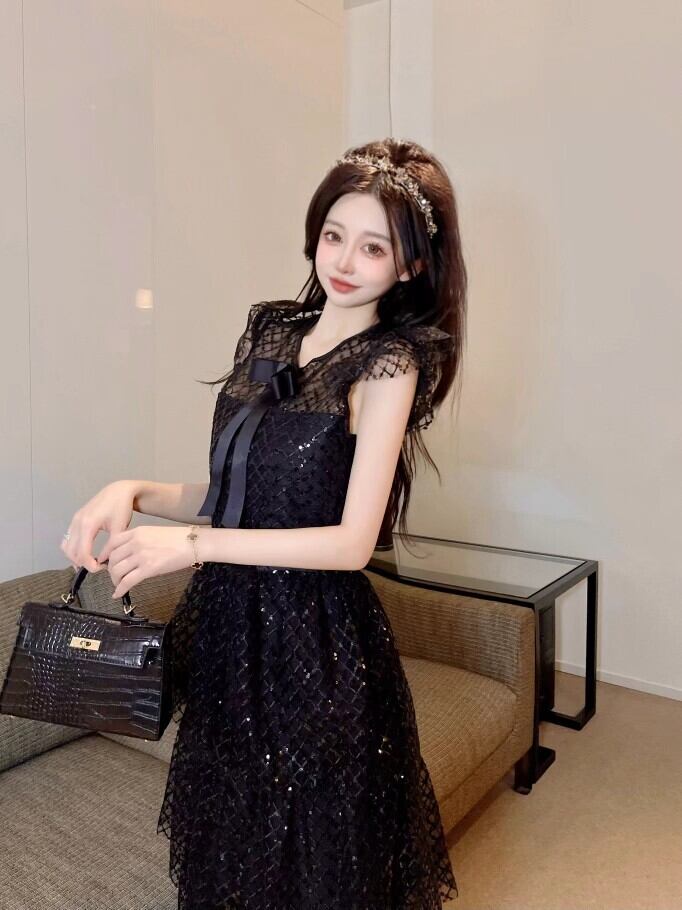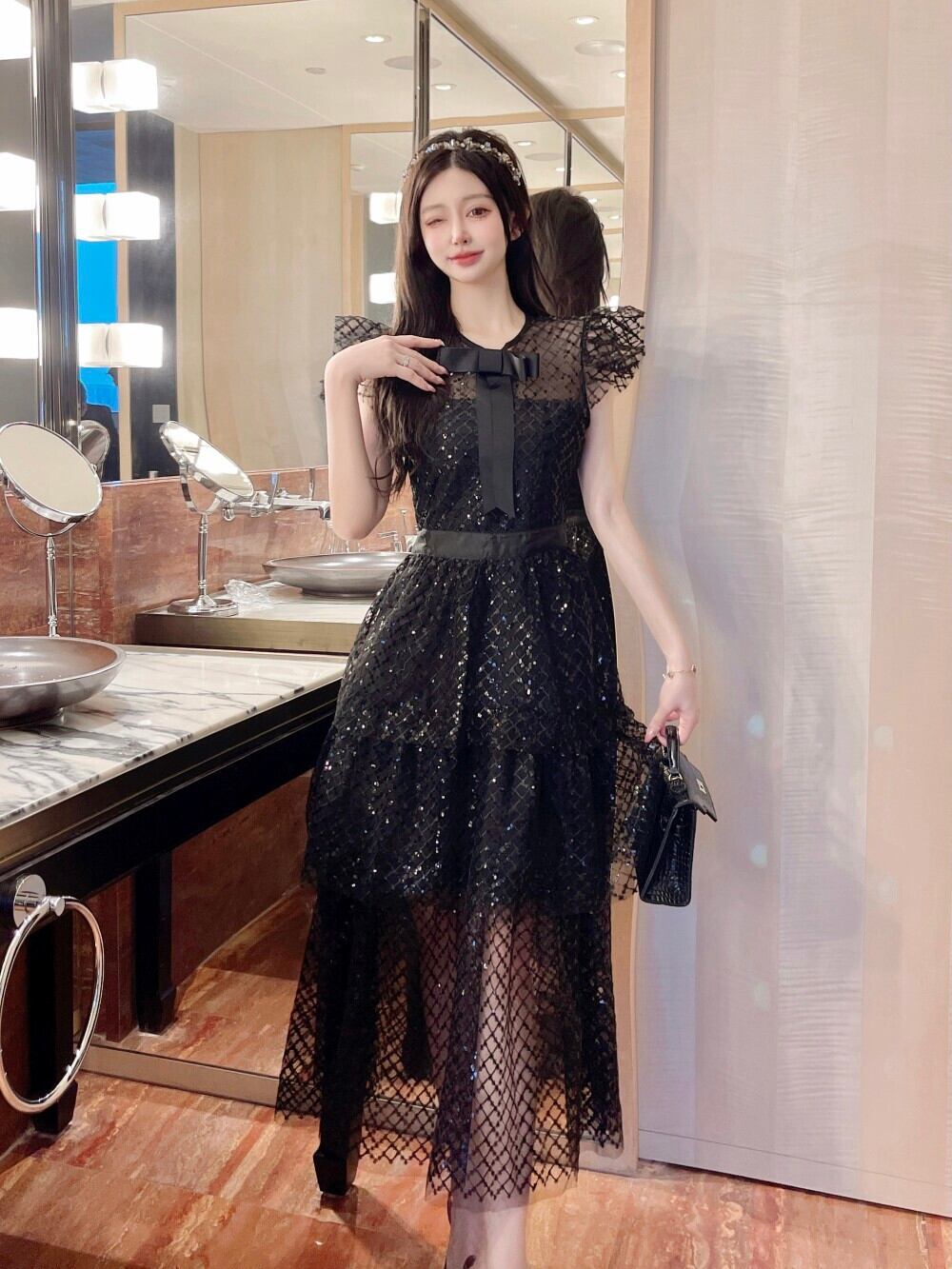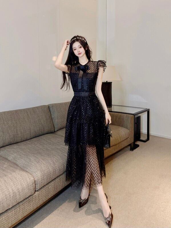 ランウェイラグジュアリースパンコールレースドレス女性サマーボウOネックノースリーブくり抜かれたヴィンテージミディパーティードレス リボン 夏物 ビンテージ Rhc24710797536