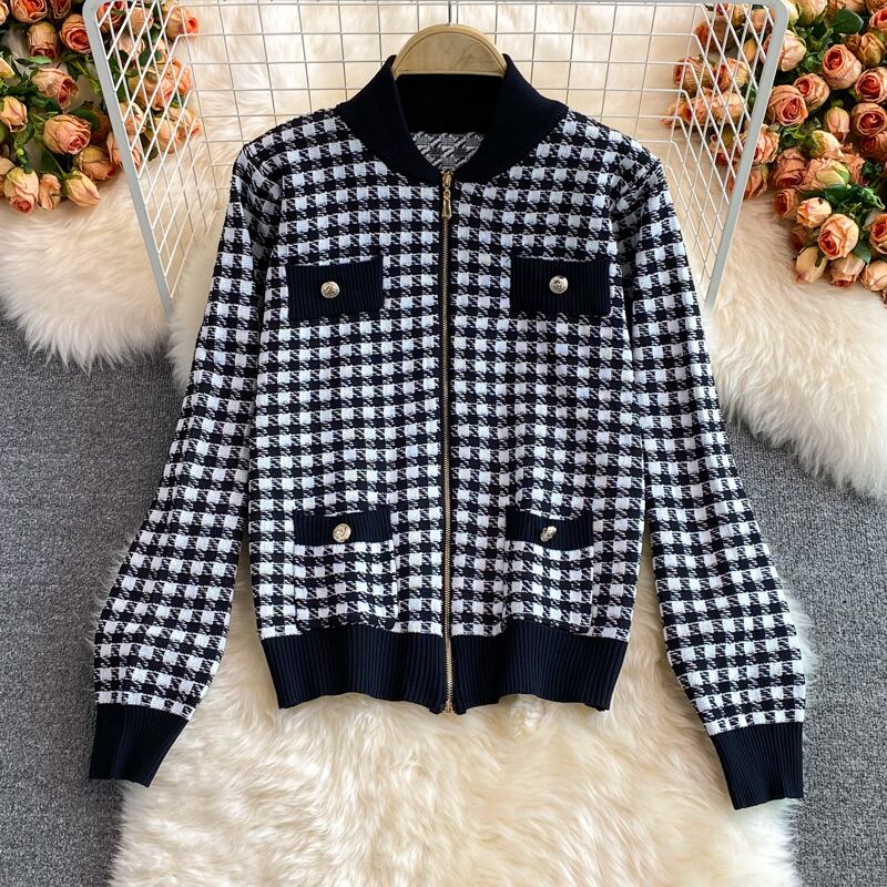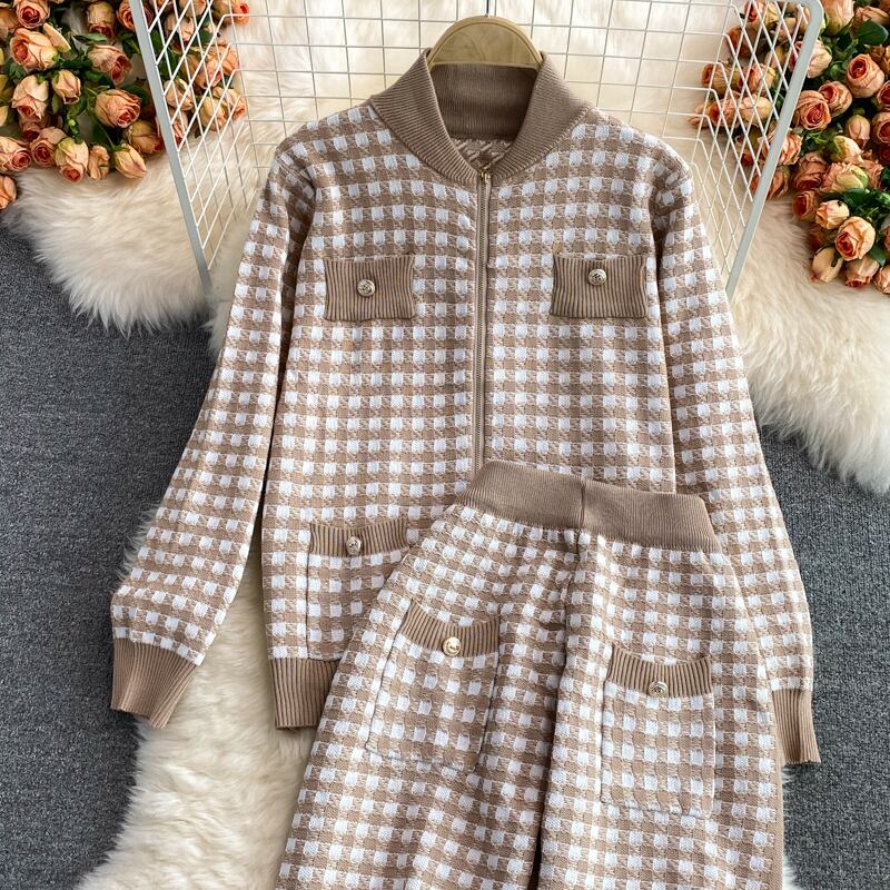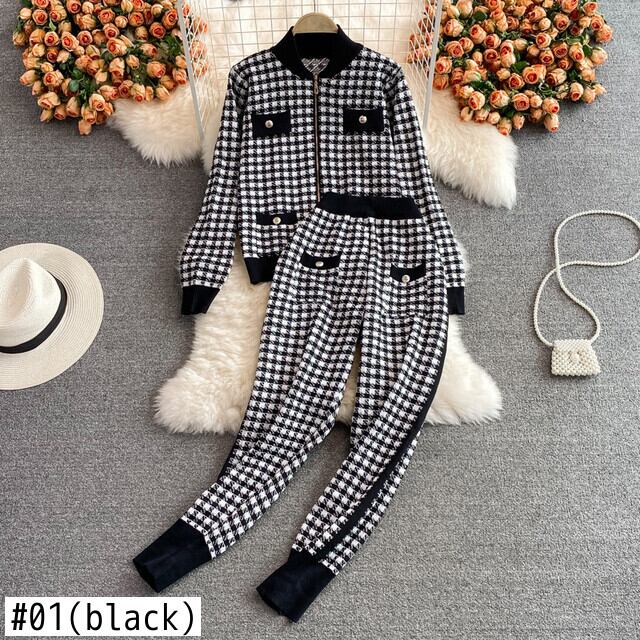 女性秋冬レトロチェック柄セット長袖ジッパーアウター+ウエストロングパンツツーピーススーツ オータム 秋物 ウィンター 冬物 Rhc96998251440