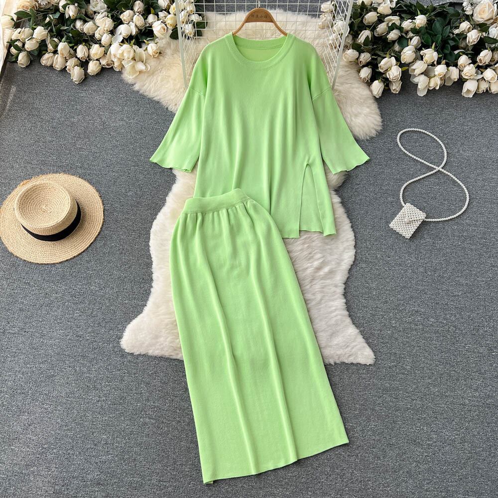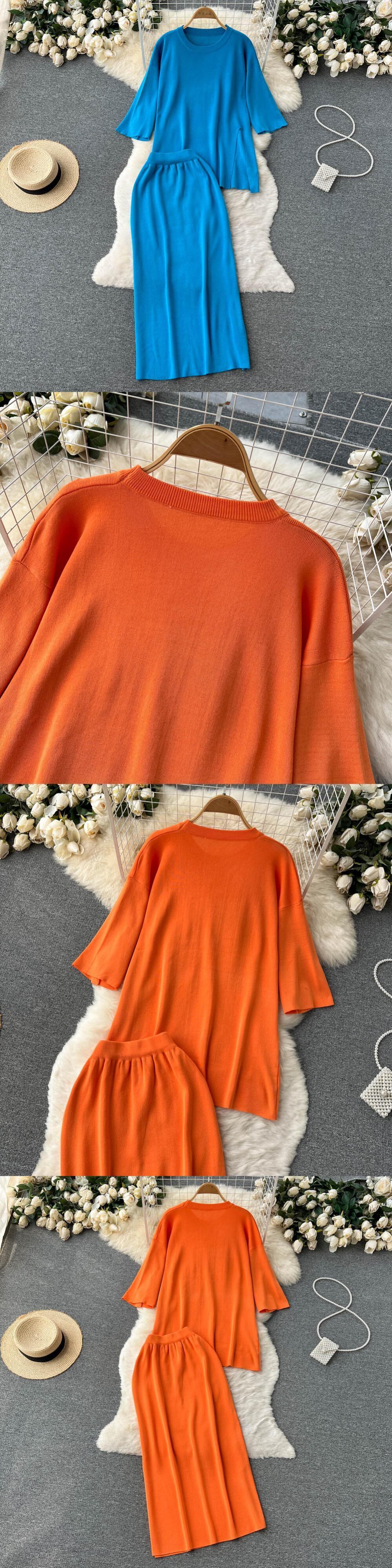 女性サマーニットセットOネックスプリットトップ+ワイドレッグロングスカートセットストリートルーズツーピーススーツ 夏物 ワイドパンツ Abe82902802613