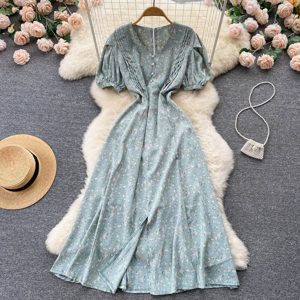 レトロなプリーツVネックボタンAラインフローラルドレス女性ハイウエストマキシドレス半袖vestido女性 ハイウェスト ショート ハーフスリーブ 花柄 Abe5286591340