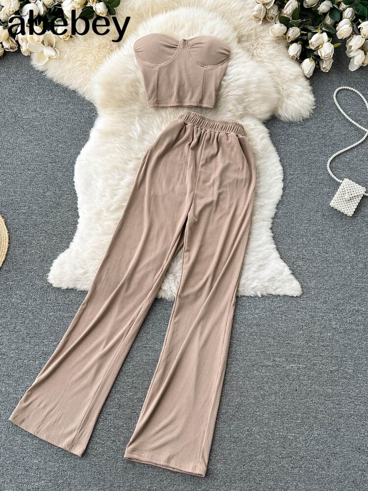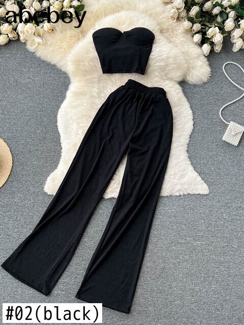 女性ソリッドセクシーツーピースセットサマーストラップレススリムキャミソール+ワイドレッグロングパンツセットストリートウェアツーピーススーツ 夏物 ワイドパンツ ソリッドカラー Abe95262888271