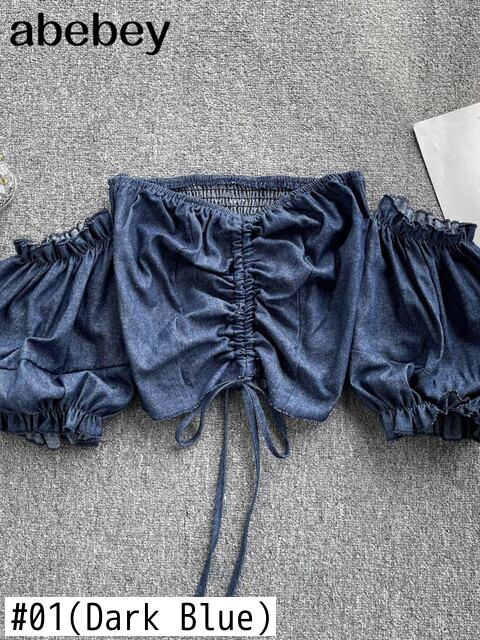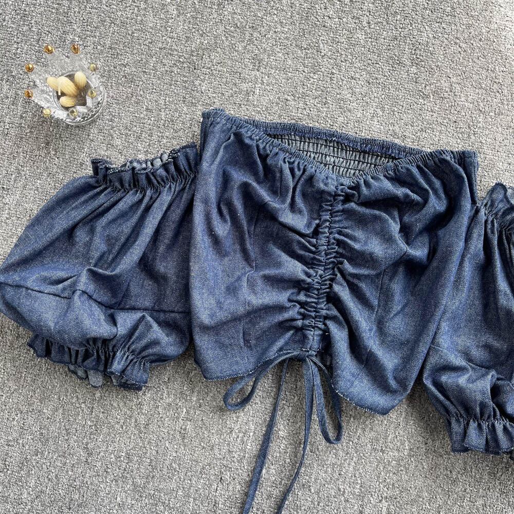 2022デニムオフショルダークロップトップスレディースサマーソリッドランタンスリーブシャツレディセクシースラッシュネックビーチブラウス 夏物 ソリッドカラー Abe76060145363