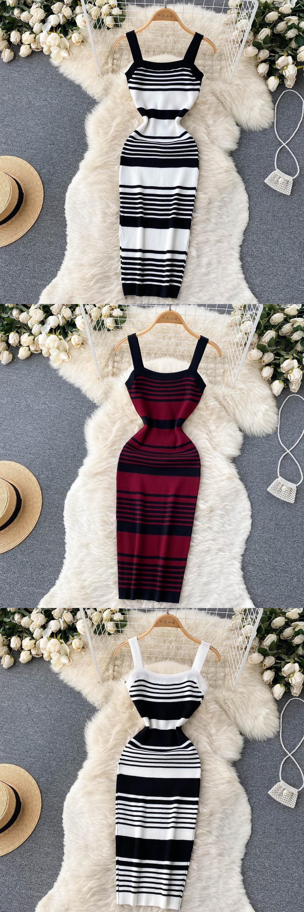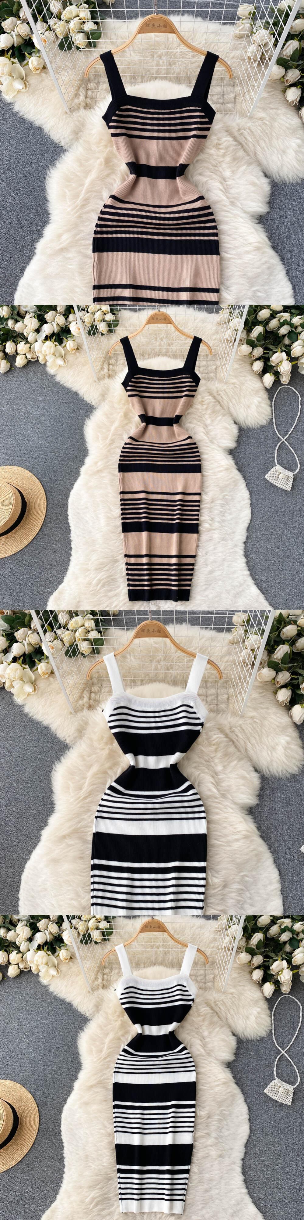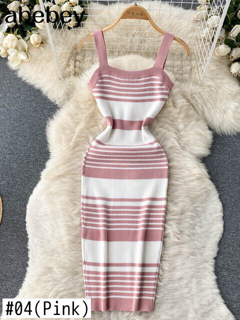 女性サマーニットドレス2022ストラップシックなニットサンドレスパーティースリムAラインストライプセクシーなドレス 夏物 Abe2424745735