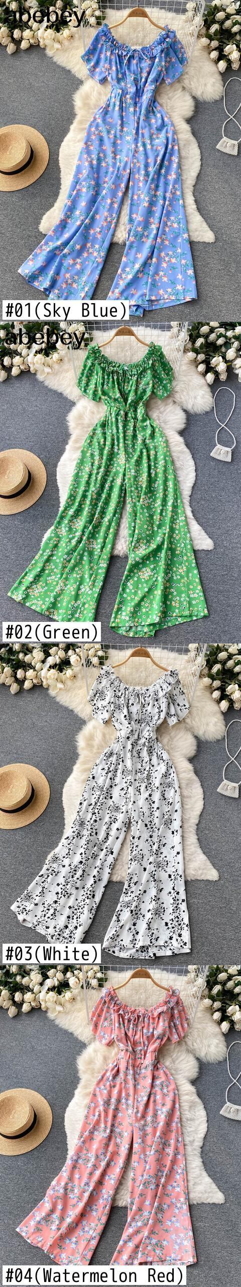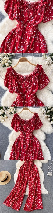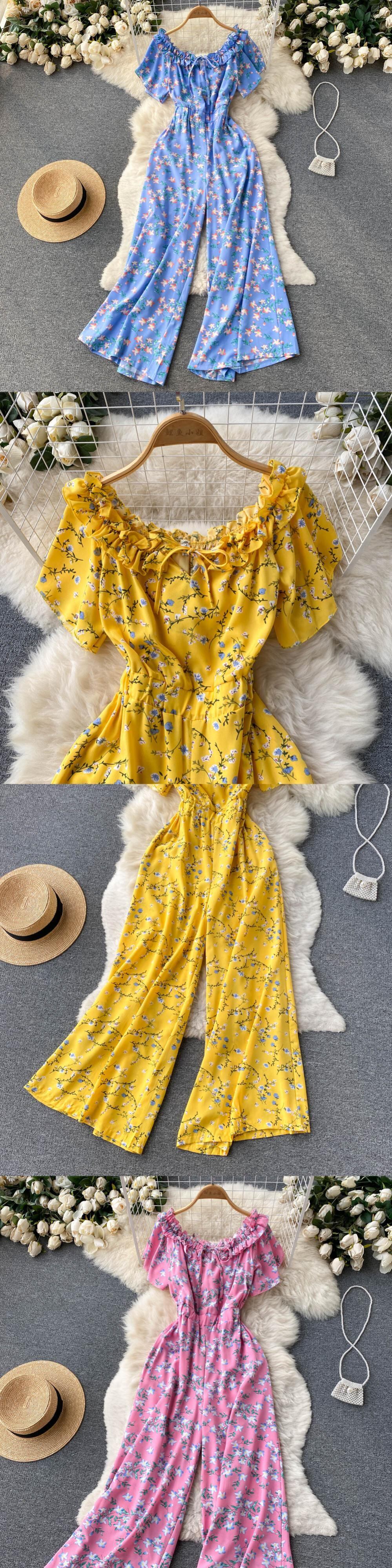 女性シフォンサマープリントジャンプスーツフローラルフリルスウィートワイドレッグロングパンツLadieBoheBeachロングジャンプスーツ ラッフル 大人ガーリー キュート カジュアル 夏物 ビーチ 花柄 ワイドパンツ Abe92583253513