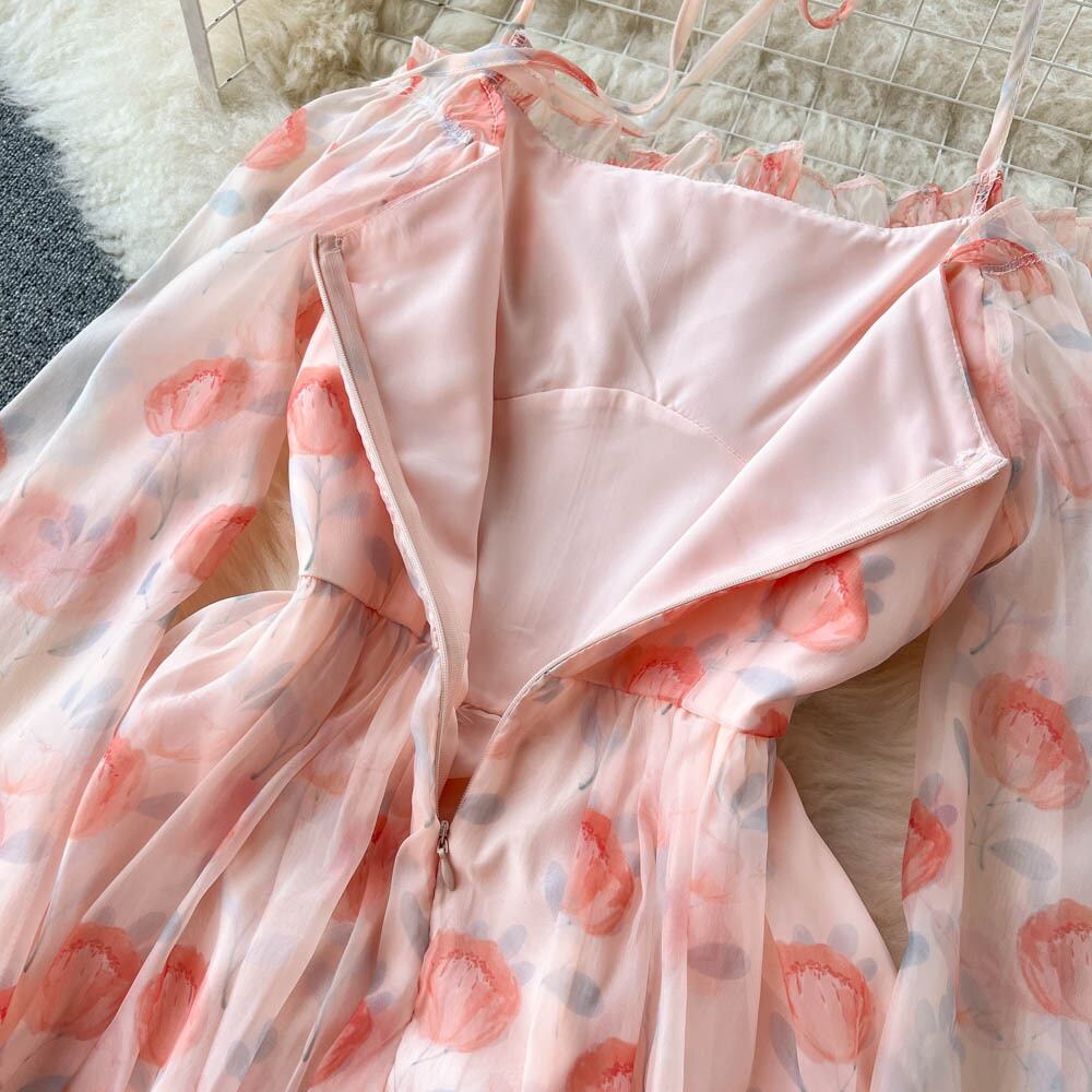 フレンチフローラルストラップマキシドレス女性長袖フリルパーティードレス夏自由奔放に生きるホリデービーチロングサンドレス ラッフル サマー 夏物 花柄 Abe83473520773