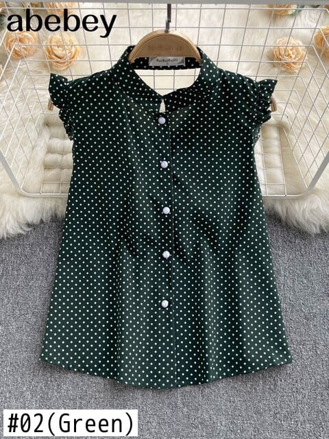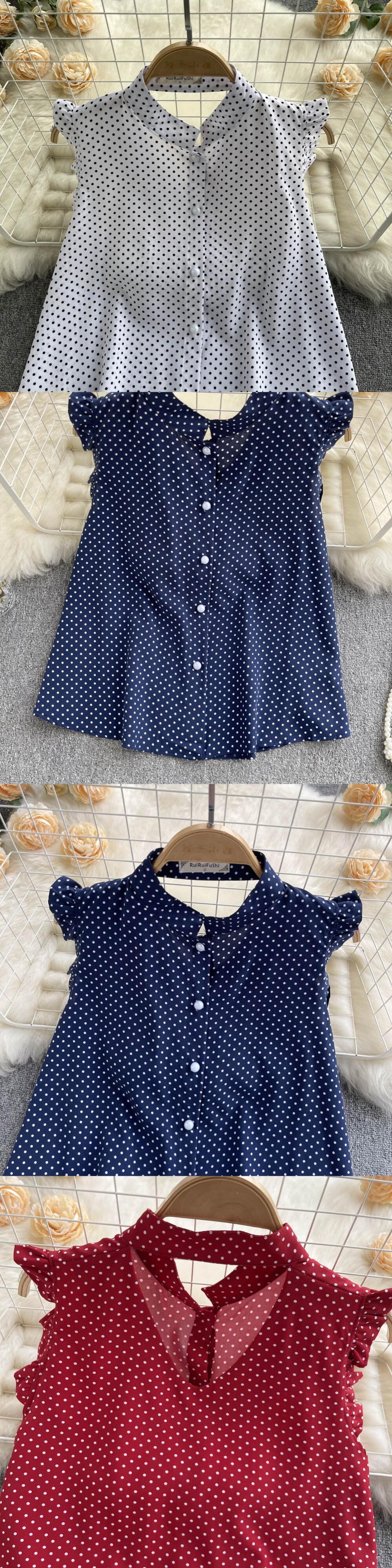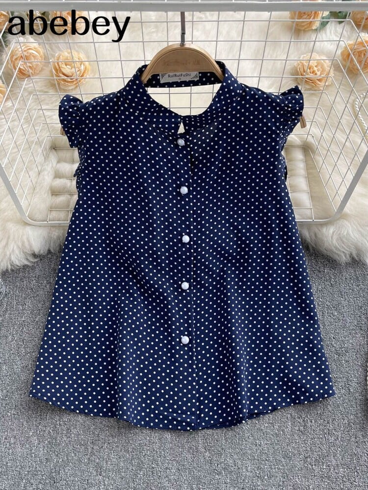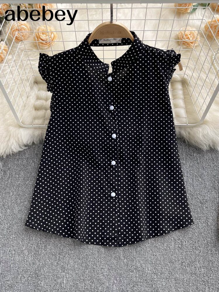 2022クロップドシャツレディースワイドノースリーブOネックブラウスシックレディサマードットブラックレスクロップトップ 夏物 Abe87682088127