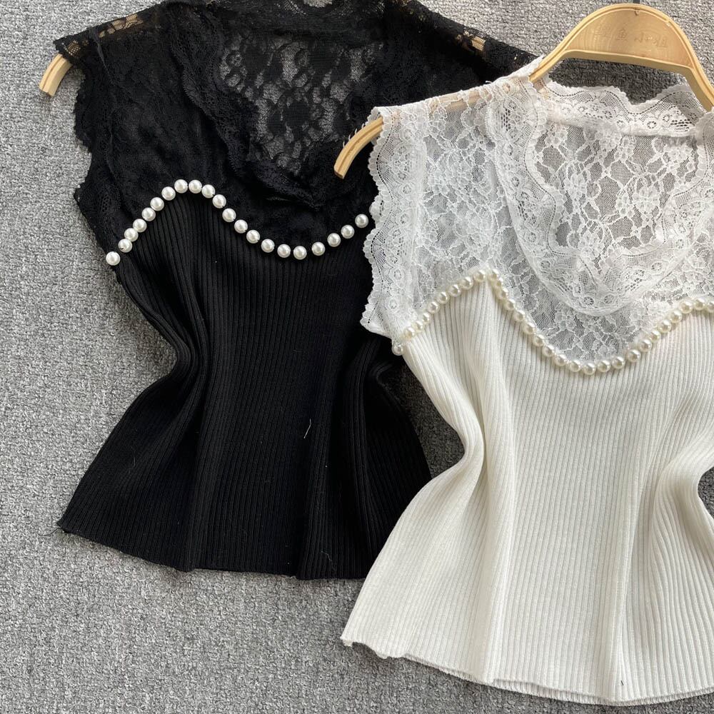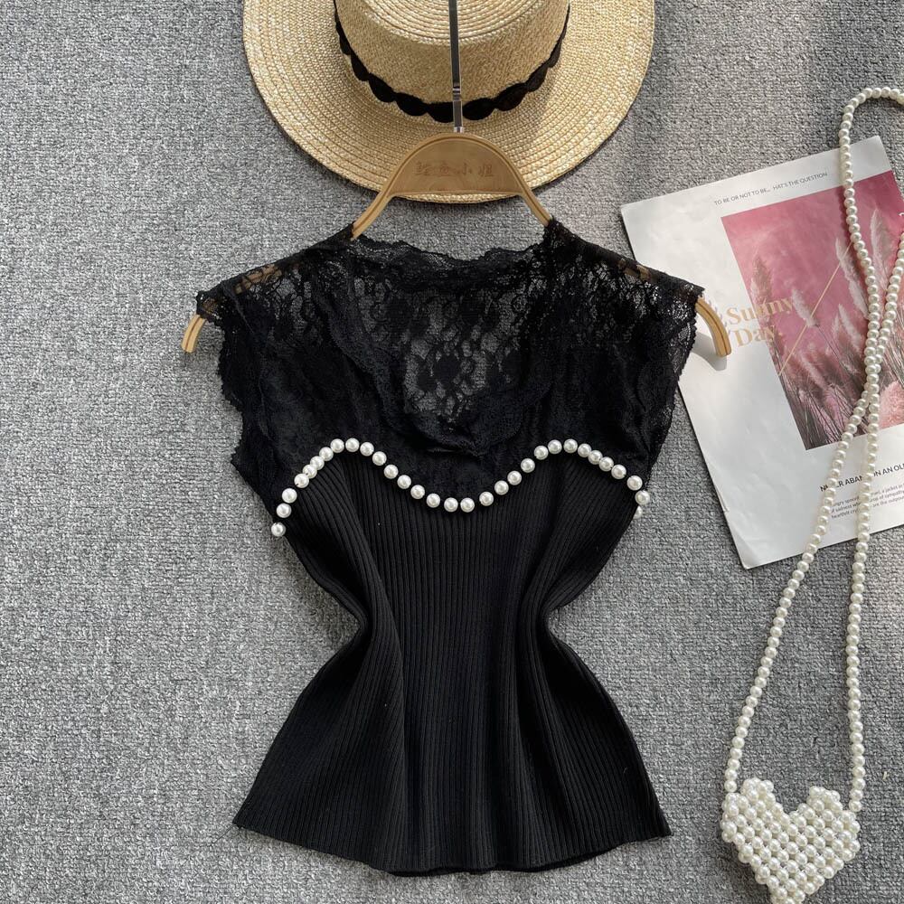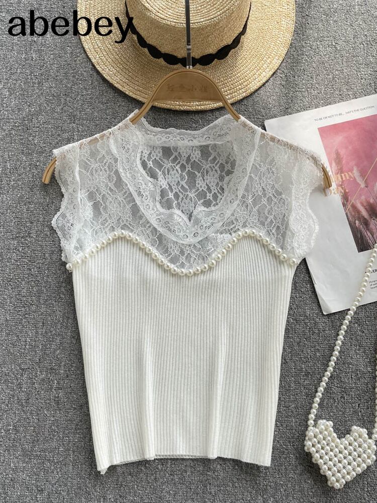 タンクトップレディースホワイト2020サマーパットワークレースベストキャンディーカラーニットオフショルダーセクシートップレディースブラウス 夏物 Abe69225143587