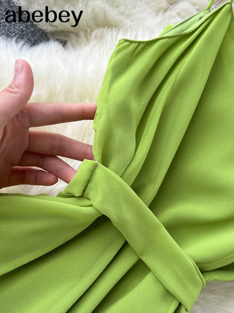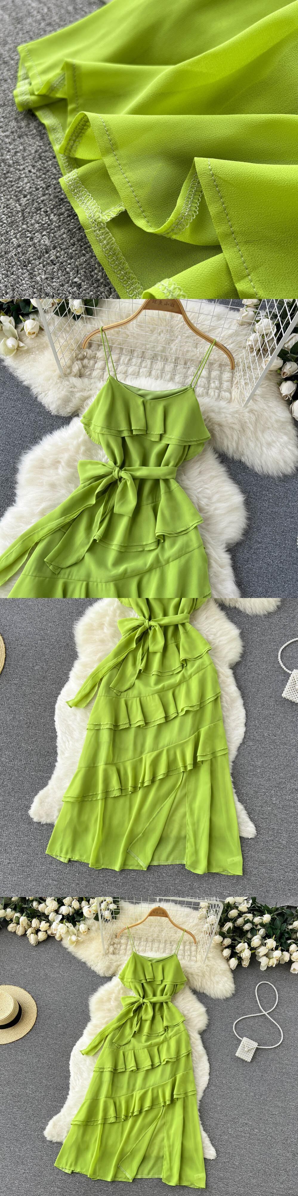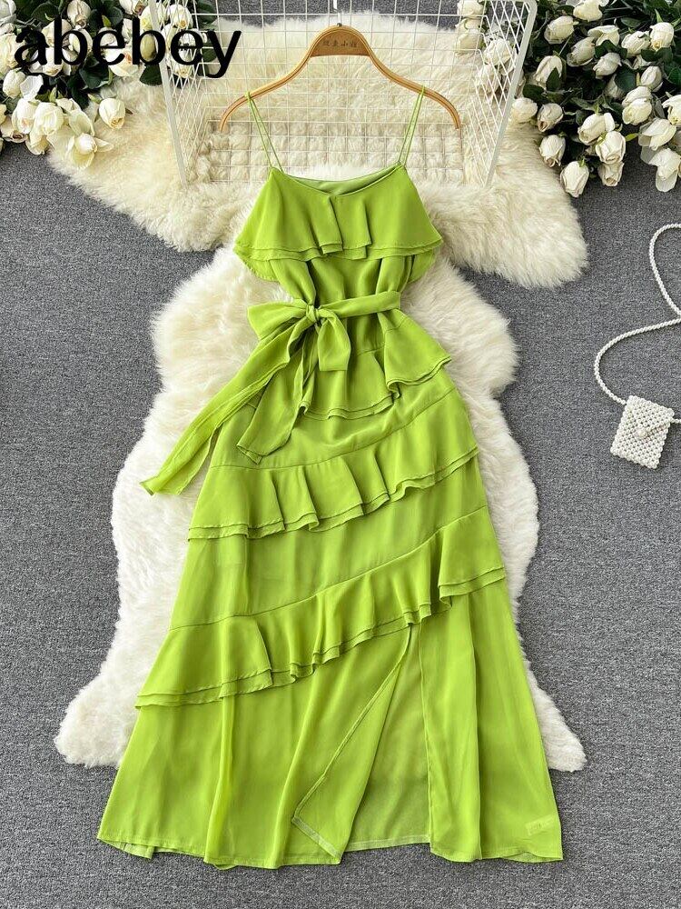 グリーンサマーローブ2022ドレス女性フリルロングパーティードレスセクシーなタンクバックレススパゲッティストラップマキシホリデーVestidos ラッフル 夏物 Abe8292645441