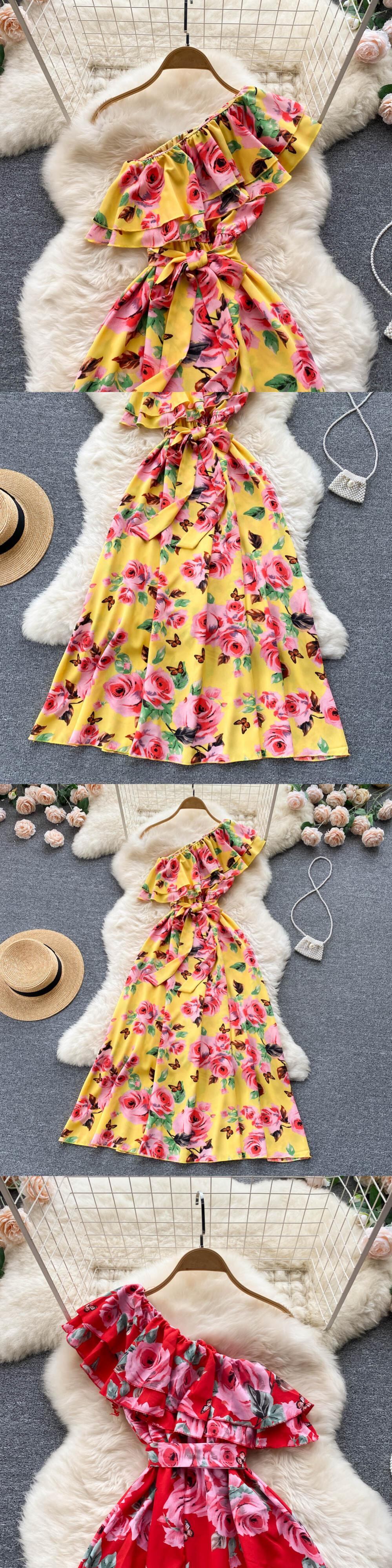 2022年女性シフォンフローラルロングドレスワンショルダーノースリーブシャーリングAラインドレスサマーボヘミアンプリントビーチドレス 夏物 花柄 Abe63198960126