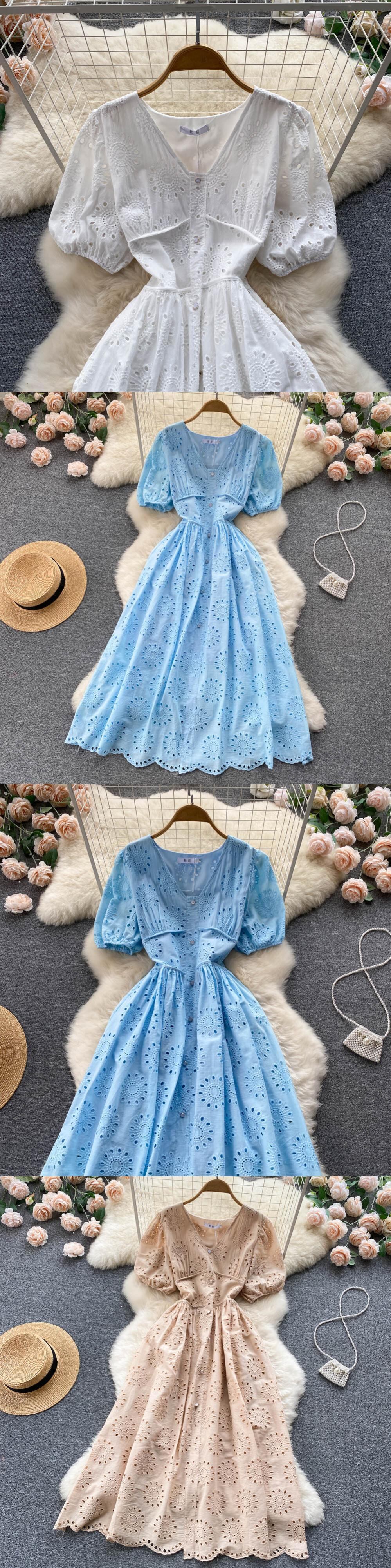グリーン/ホワイトシックピンクVネックステッチレースフックフラワーウエストシンバブルスリーブドレス2022夏 サマー 夏物 フラワーデザイン Abe28280017580