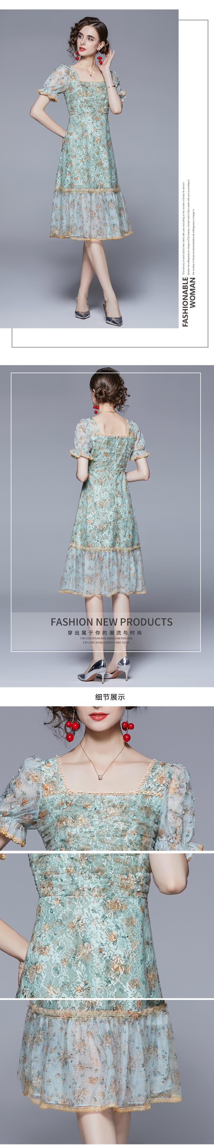 ランウェイサマーウィメンズプリントレースパッチワークスクエアカラーパフスリーブダイヤモンドホリデーAラインドレス 夏物 スクウェア Rhc82545636873