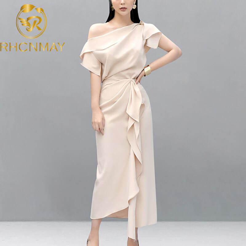 2020ランウェイスタイル2ピースセットレディースサマースラッシュネック無地トップス&ウエストフリルロングスカート ラッフル 夏物 ソリッドカラー Rhc12842919265