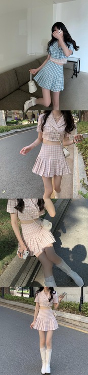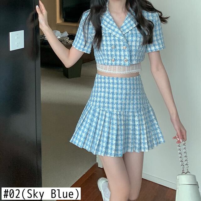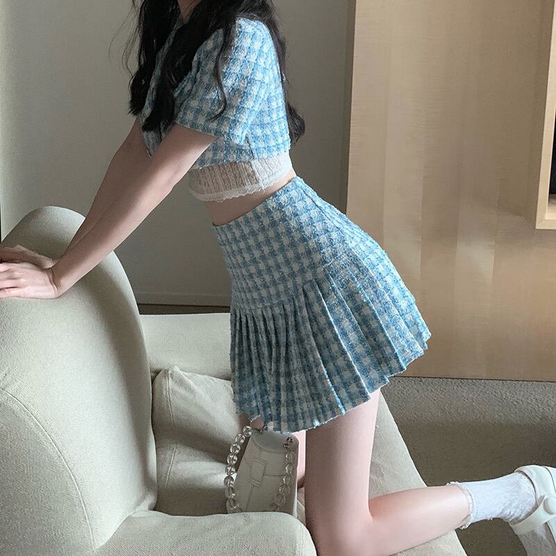テンペラメント春秋スーツ半袖ノッチ付きブルーチェック柄ジャケットレディースクロップ+ウエストミニプリーツスカート ショート ハーフスリーブ スプリング 春物 オータム 秋物 Rhc57125685340