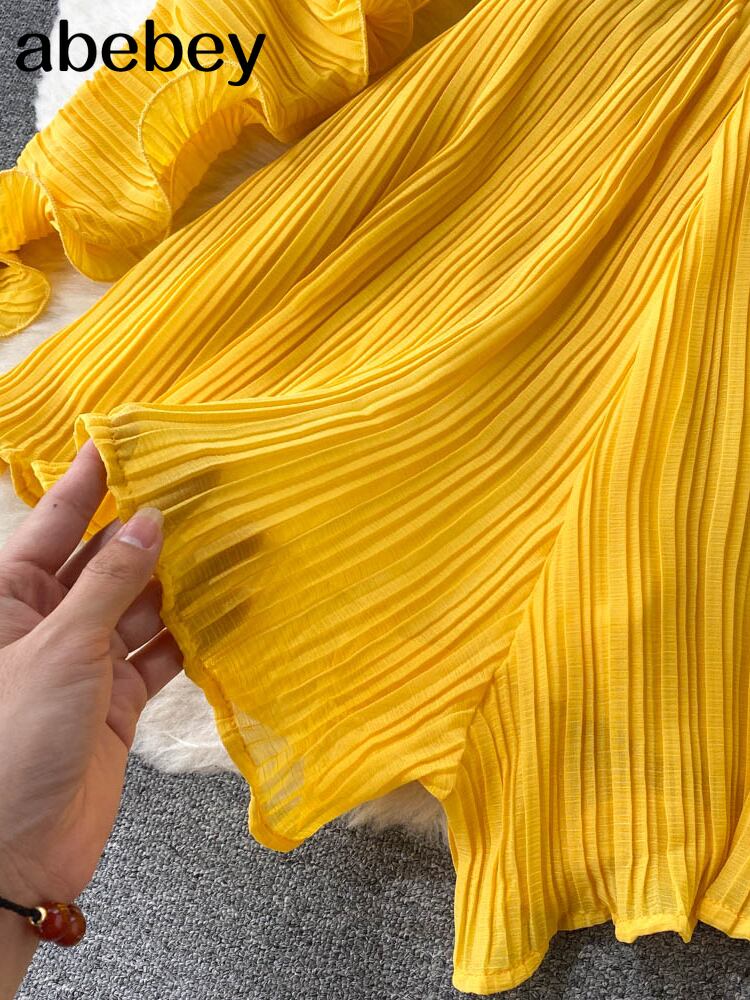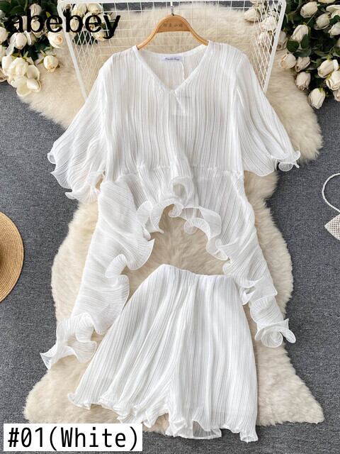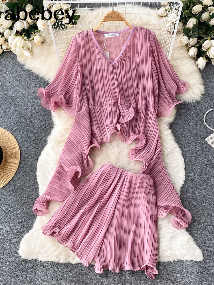 サマーシフォンプリーツ2ピースパンツスーツシックなVネックフレアスリーブロングブラウス&ショーツセットツーピースセット 夏物 ブルマー Abe84711320084