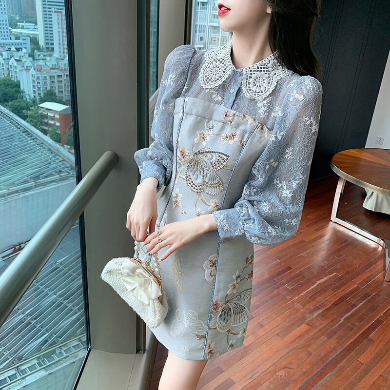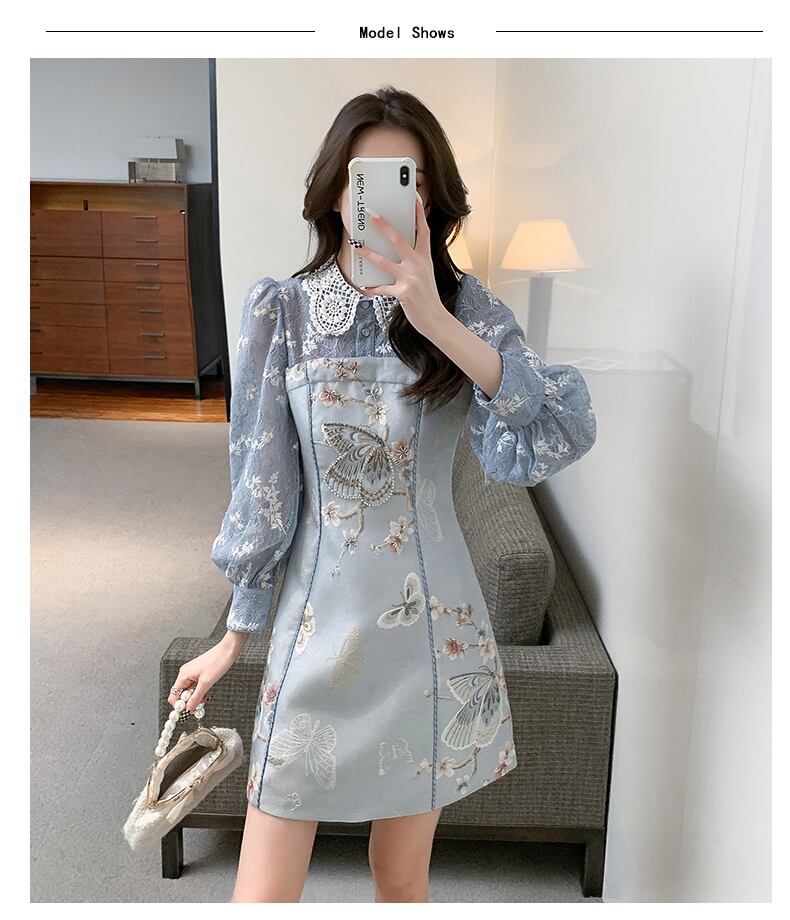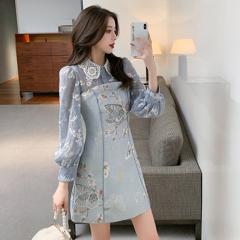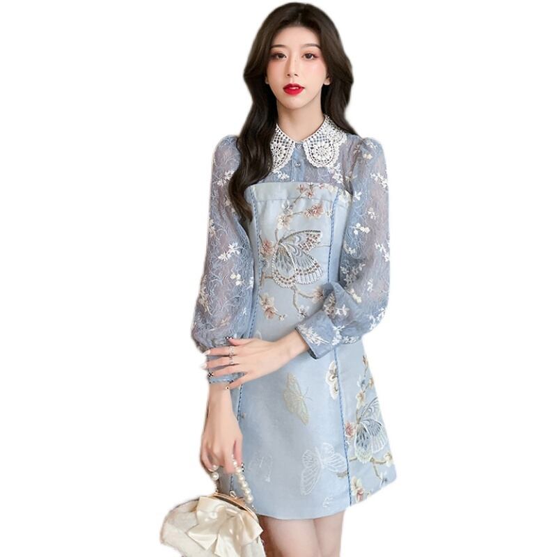 2021年秋のエレガンスショートドレスレディースレース刺繡ランタンスリーブダイヤモンドバタフライジャカードドレス 刺繍 オータム 秋物 Rhc553349039