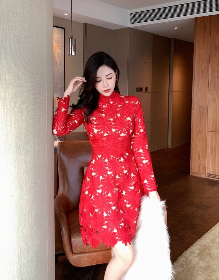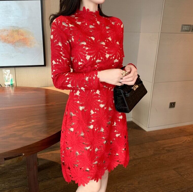 中空アウトレース花刺繡ドレス春秋女性スタンドカラー長袖ウエストショートドレス ロング 刺繍 スプリング 春物 オータム 秋物 花柄 Rhc14715602991