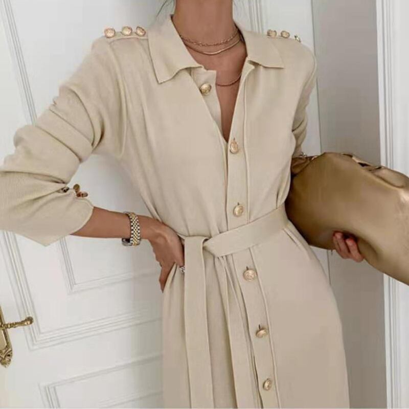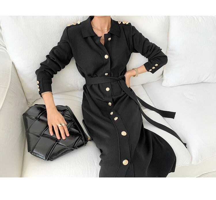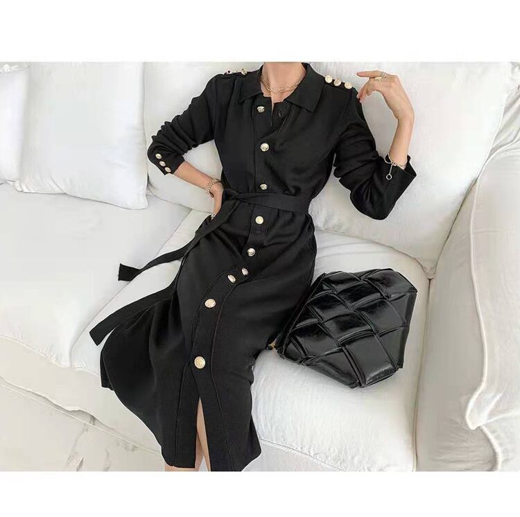 女性ニットロングドレスシングルブレストロングスリーブターンダウンカラーニットドレスオフィスニット 長袖 会社 学校 通勤や通学にも Rhc10534638600