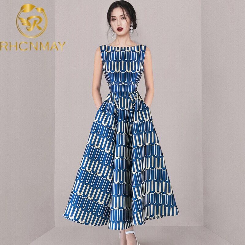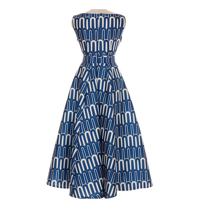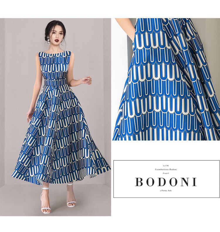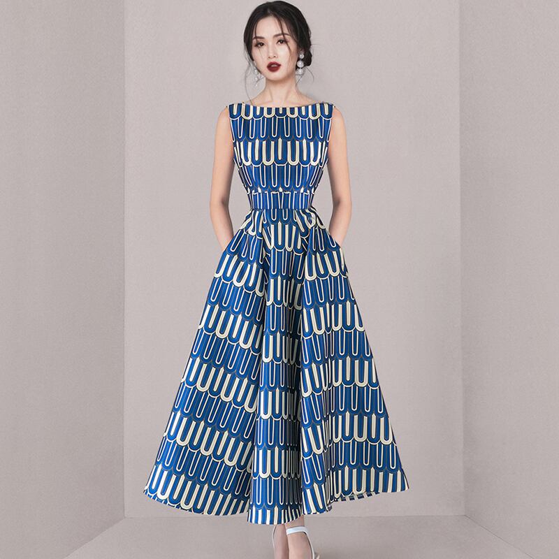 2022年夏のミディドレス滑走路の女性ブルーノースリーブOネックジオメトリ印刷ビッグウィングオフィスレディ サマー 夏物 会社 学校 通勤や通学にも Rhc91773274865