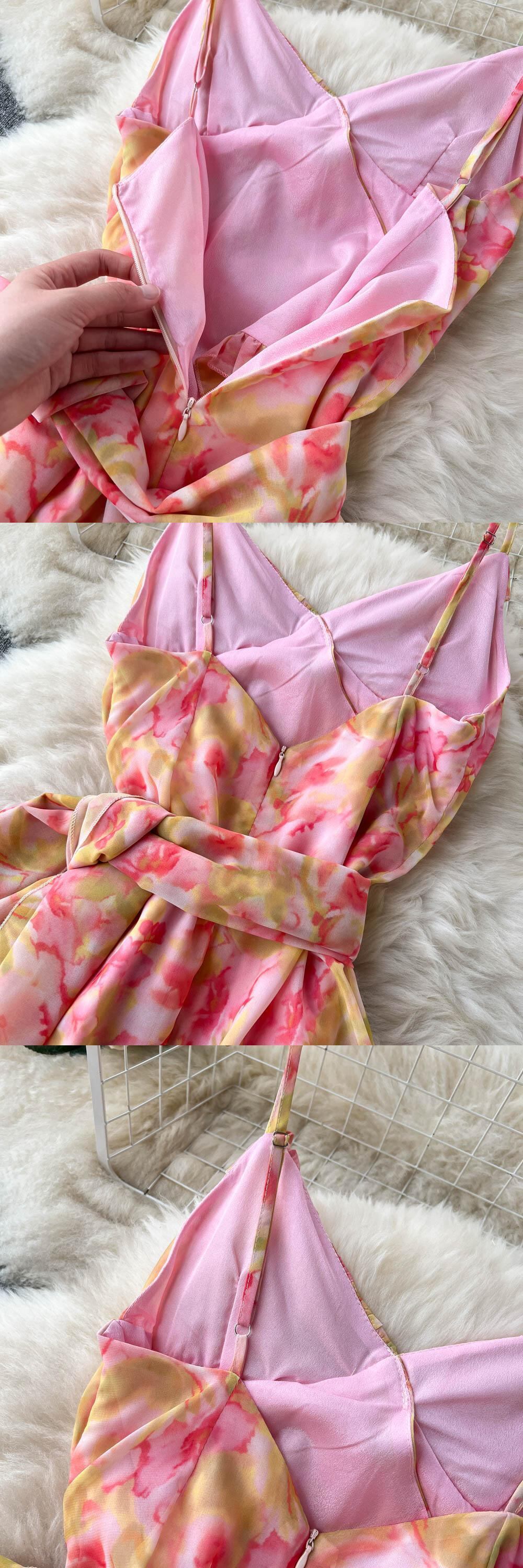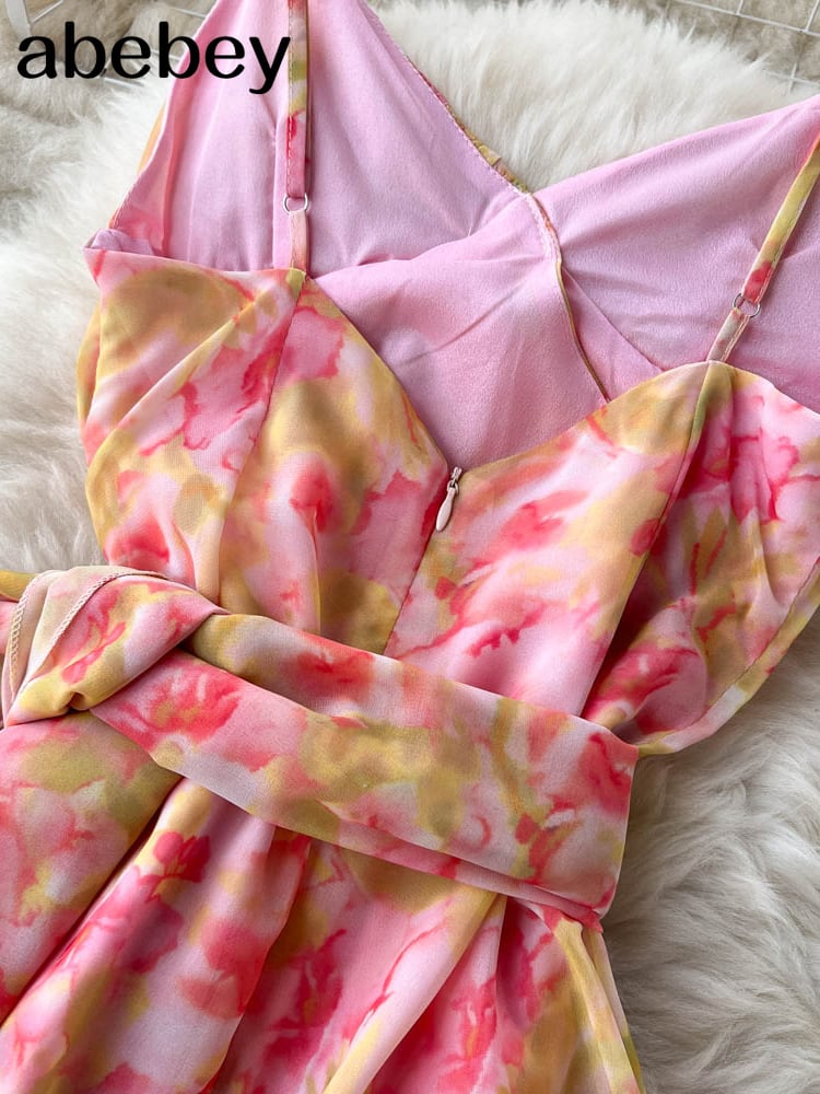 夏の女性シフォンストラップドレスノースリーブフリルスウィートプリントサンドレスビーチクラブセクシースプリットロングドレスサンドレスローブ 大人ガーリー キュート カジュアル サマー 夏物 Abe48227737966