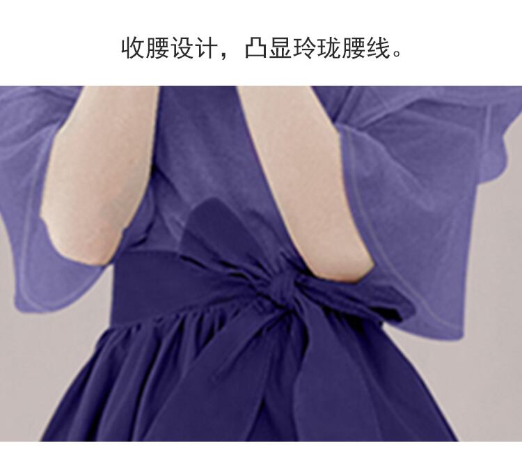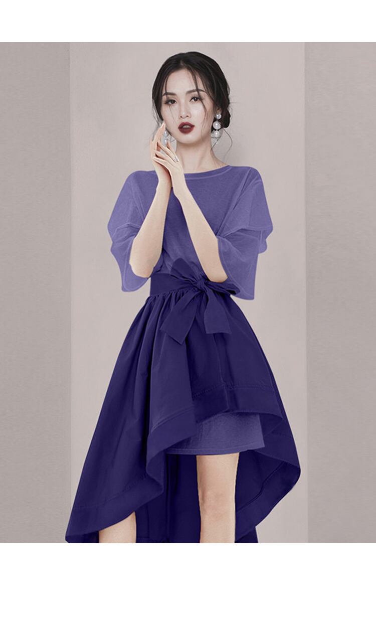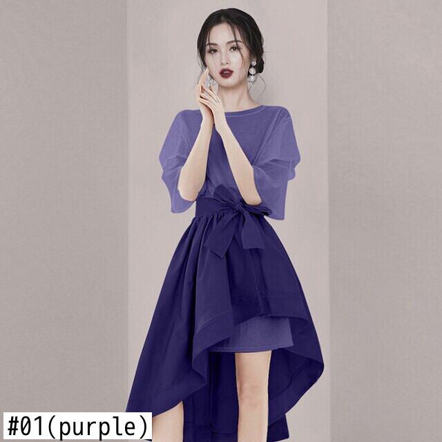 滑走路2022女性2ピースセットサマーパフスリーブロングパープルTシャツトップス+ボウイレギュラーAラインスカートスーツ リボン 夏物 Rhc48390292686