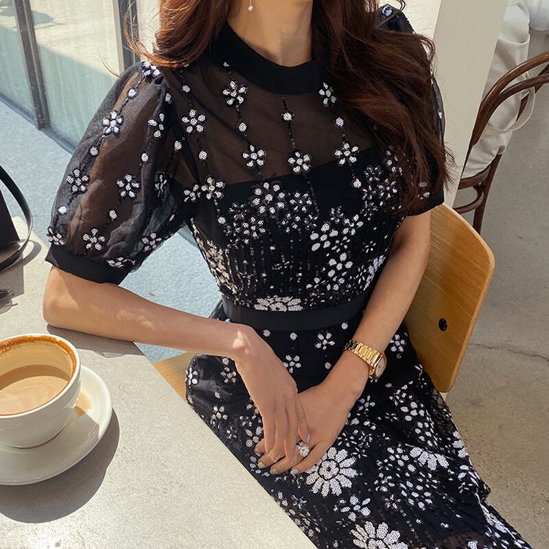 セルフポートレートヴァンテージドレス2020サマーブラックメッシュ刺繡花ミディドレスOネック半袖女性 ショート レッド ハーフスリーブ 刺繍 夏物 フラワーデザイン Rhc97172990457