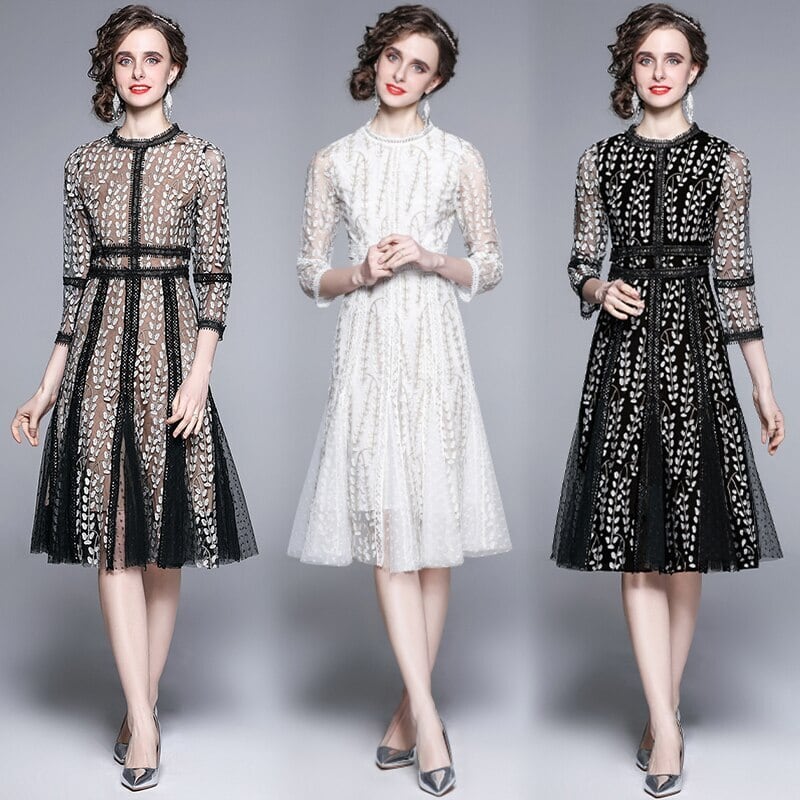 高級女性花刺繡パーティードレスレディフランストレンディメッシュミディVestidos 刺繍 フラワーデザイン Rhc83070574894