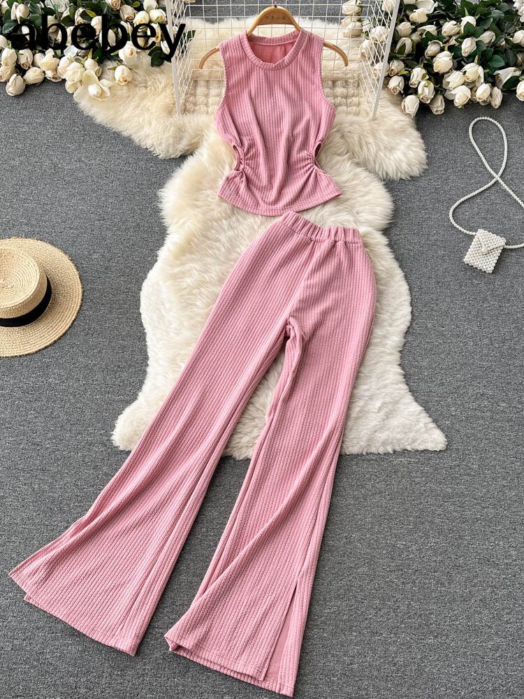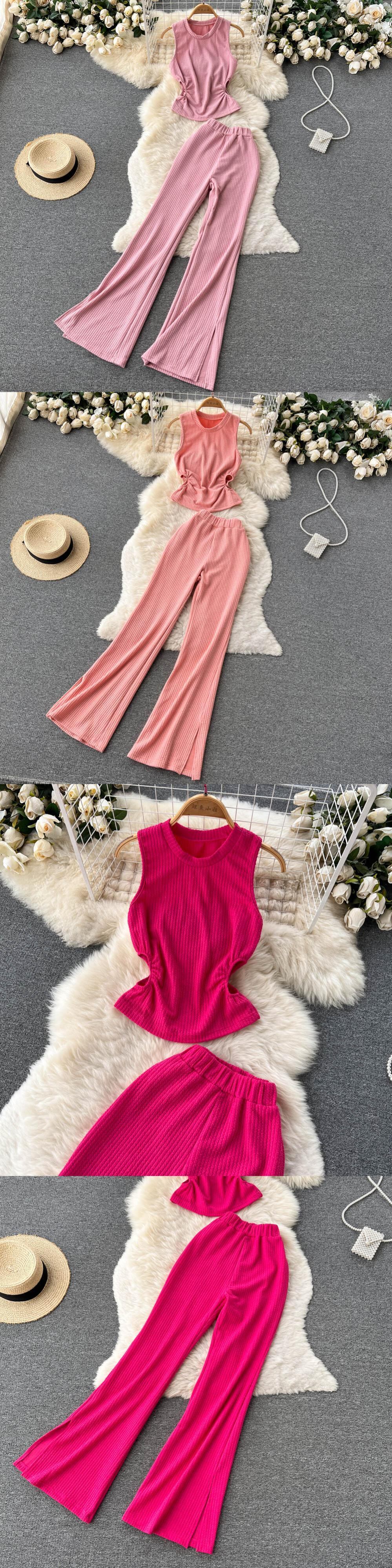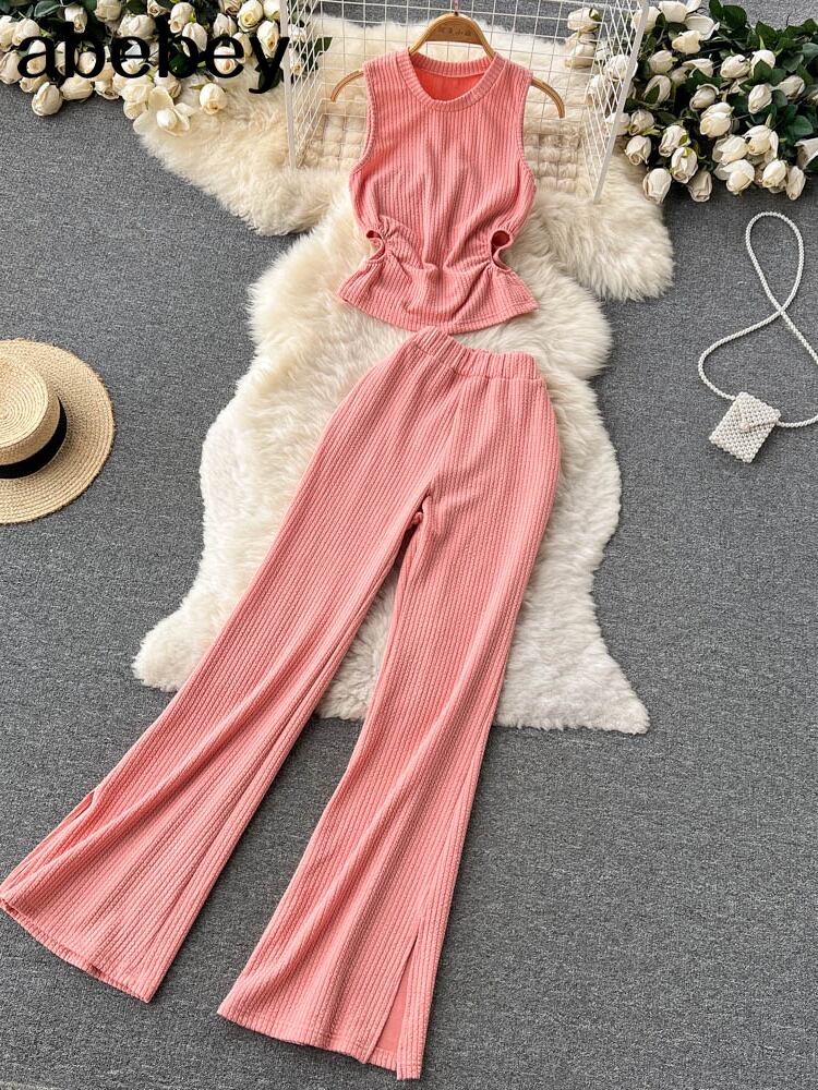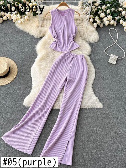 女性パンツセットボディコンスリムホローアウトショートタンクトップ+ストライプワイドレッグロングパンツソリッドサマーツーピーススーツ 夏物 ワイドパンツ ソリッドカラー Abe80622232230