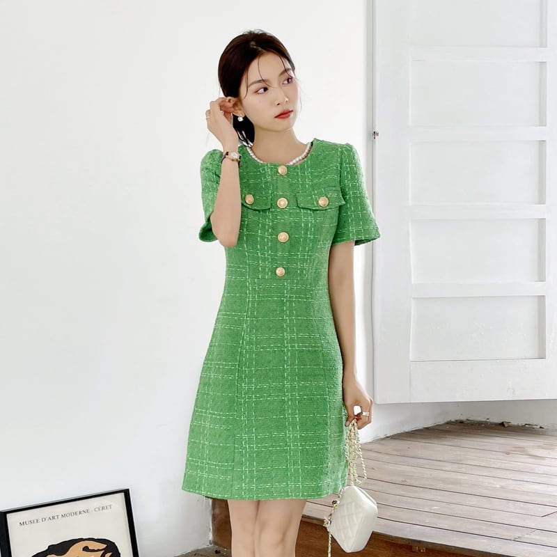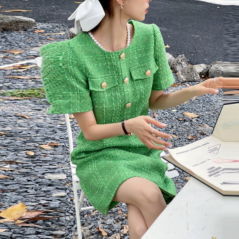 オフィスレディミニドレス女性夏半袖パーティーソリッドグリーンツイード女性ドレスローブ ショート ハーフスリーブ サマー 夏物 ソリッドカラー 会社 学校 通勤や通学にも Rhc53491404512