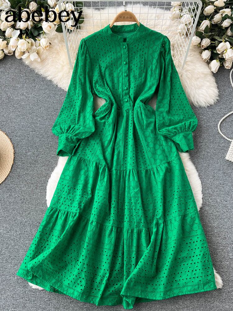 緑2022夏自由奔放に生きる女性マキシドレスゆるい刺繍ホワイトレースビーチドレス休暇ホリデー女性ランタンスリーブ サマー 夏物 グリーン Abe68638954891