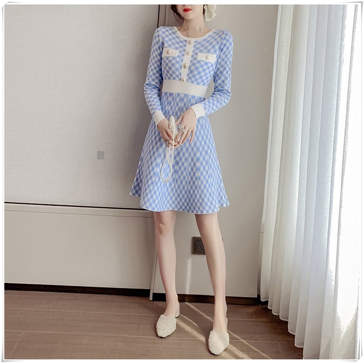 2021年秋のニットセータードレス女性ボタンアップチェック柄ブルーブラックミニドレスローブVestidos オータム 秋物 Rhc71014655948