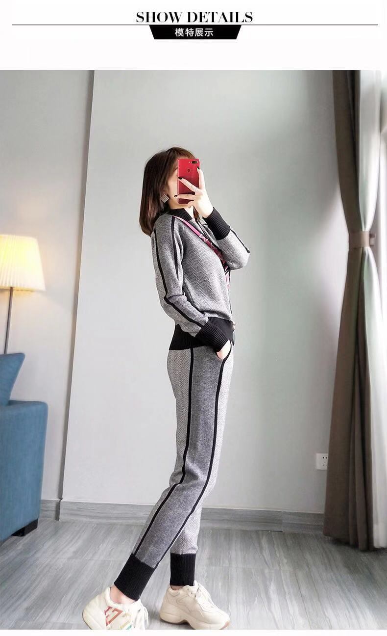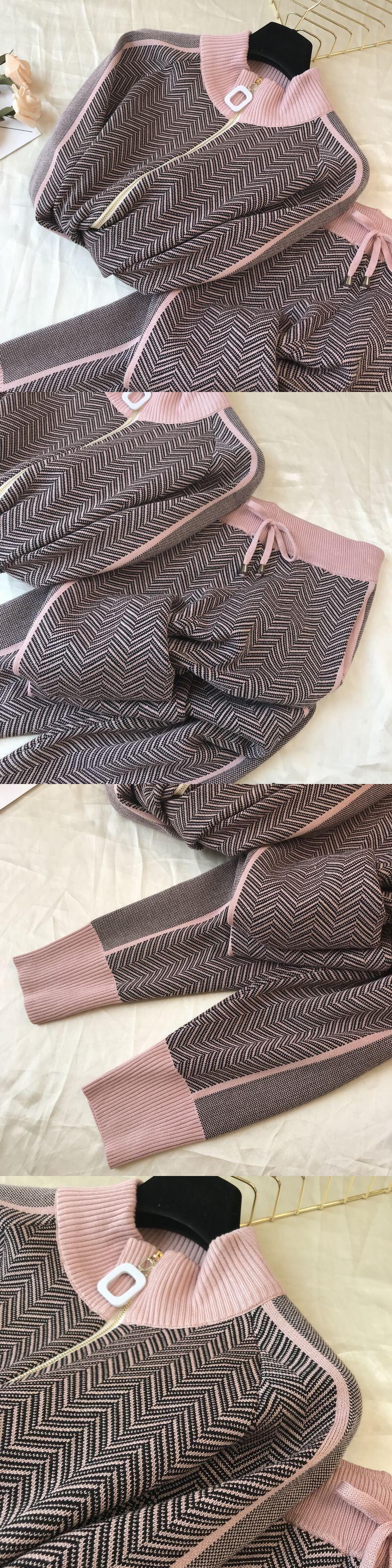 冬の女性のトラックスーツ幾何学的なストライプTurtleneckジッパーニットカーディガン+パンツ女性2ピースセット ウィンター 冬物 Rhc89177331214