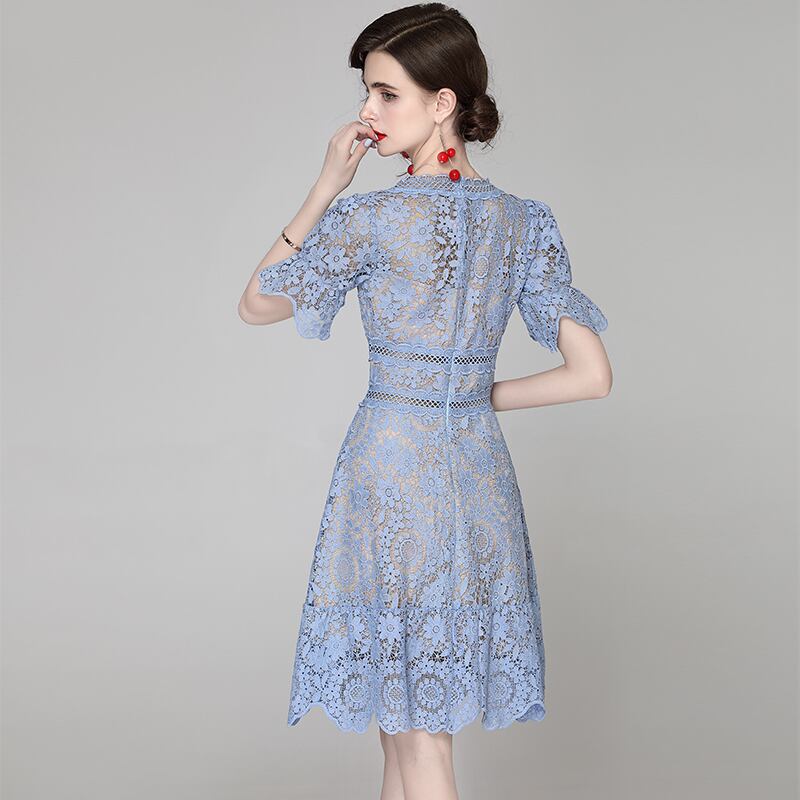 夏の女性の中空アウトブルーレースパーティードレス半袖ウエスト膝丈Vestidos ショート ハーフスリーブ サマー 夏物 Rhc13274121019