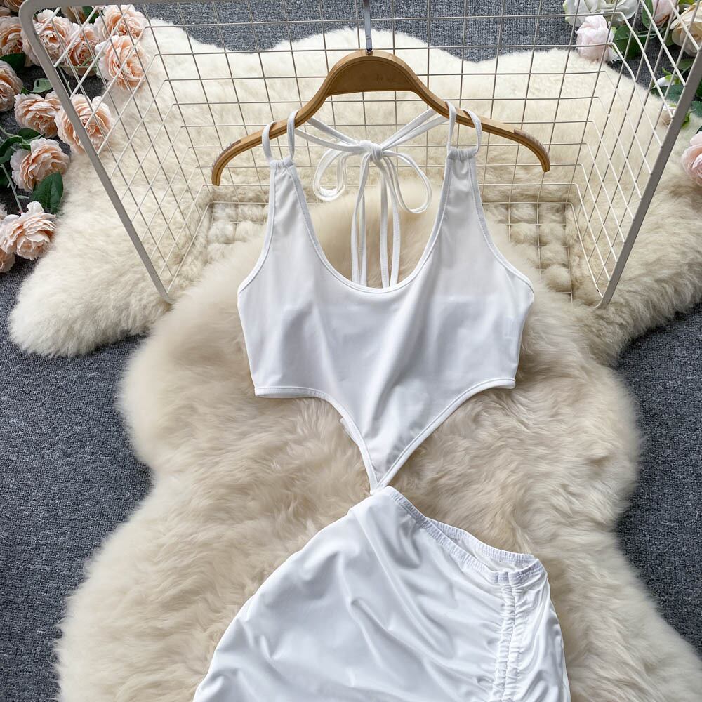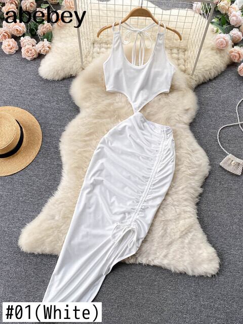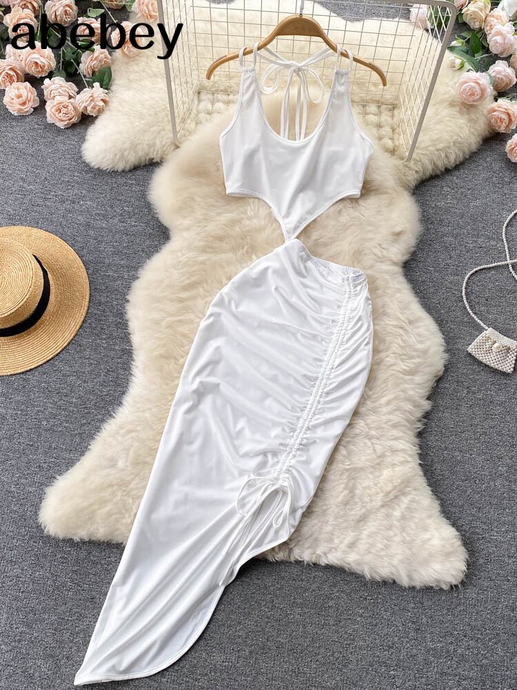 女性のセクシーなツーピースの服セット女性のスーツ無地のラウンドカラーベストとウエストスプリットロングスリットスカート夏 サマー 夏物 ソリッドカラー Abe9326220057