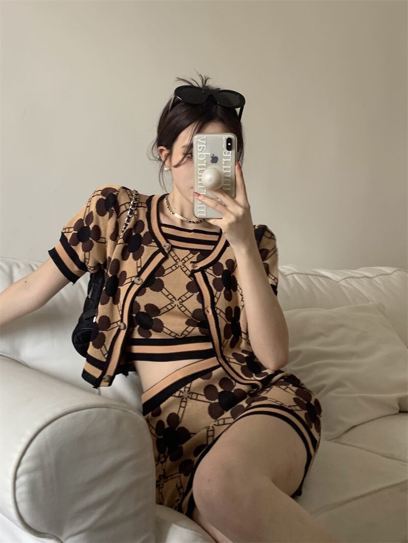 スウィートジャカードニット3点セット女性半袖Oネックカーディガンキャミソールミニスカートショートセーターセット衣装 ハーフスリーブ 大人ガーリー キュート カジュアル Rhc64046038245