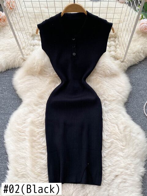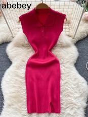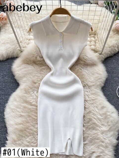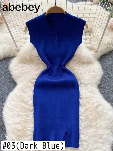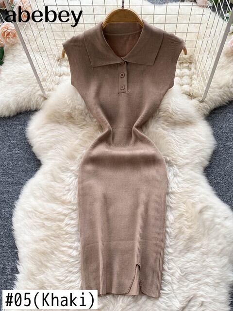 女性のニットドレス長袖ターンダウンカラー弾性スリムペンシルドレス2022夏のセクシーなボディコンスプリットセータードレス ロング エラスティック 伸縮 サマー 夏物 Abe18885774840