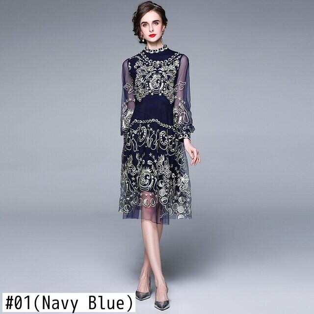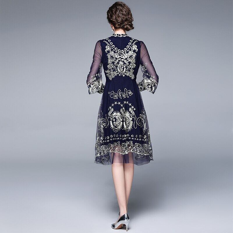 トップ刺繡ドレス2020夏の滑走路の女性豪華な黄金の刺繡長袖ブルーセクシーメッシュドレスVestido ロング 刺繍 サマー 夏物 Rhc90293391450