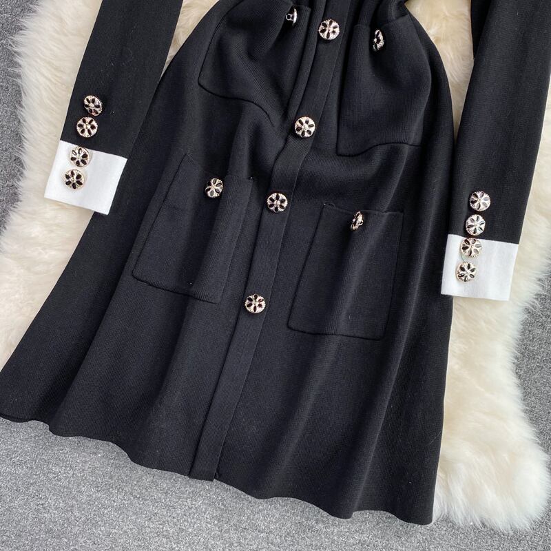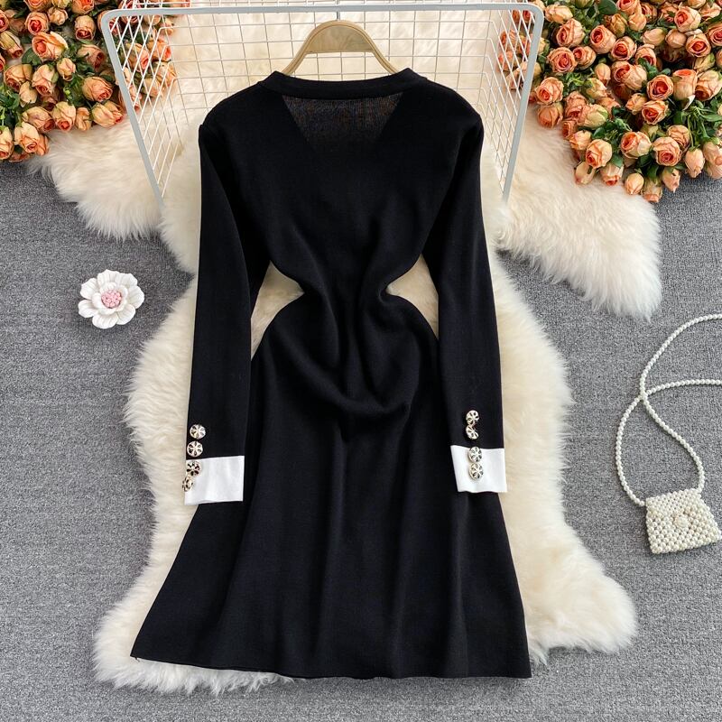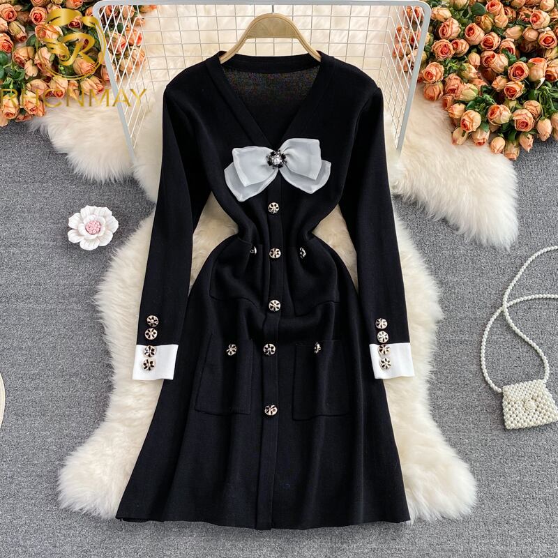 女性秋のパーティーショートドレス長袖ボウポケット黒編みペンシルドレス ロング ブラック リボン オータム 秋物 Rhc77056444478