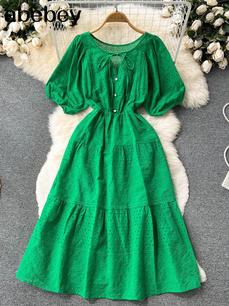 中空ハイウエストと薄手のパフスリーブOネックドレスエレガントな気質ホリデービッグスイングドレスドレス春と秋 ハイウェスト スプリング 春物 オータム 秋物 Abe62045252824