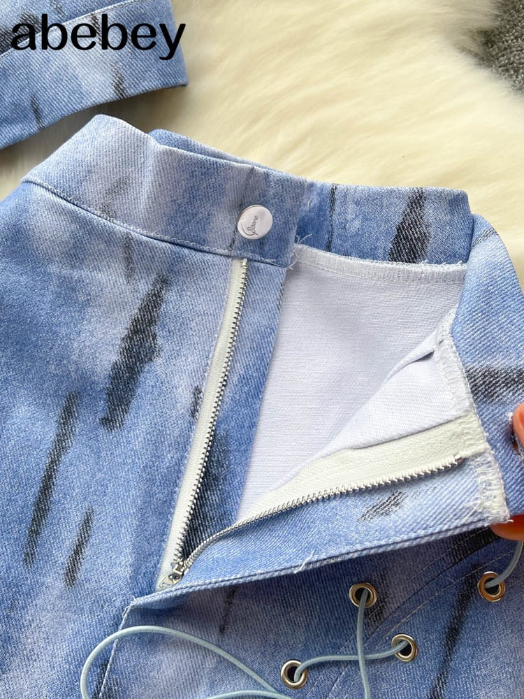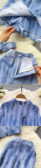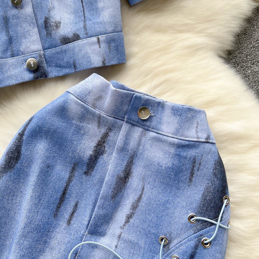 フレンチスタイルデニムレディースセット2022年夏シングルブレストポロネックトップス+ミディAラインスカートツーピースセット サマー 夏物 Abe59963602673