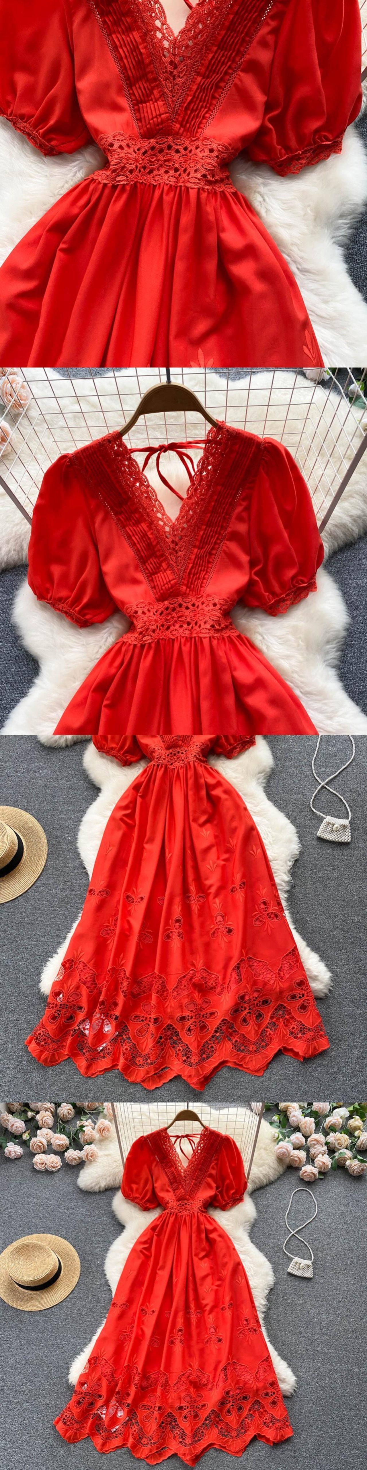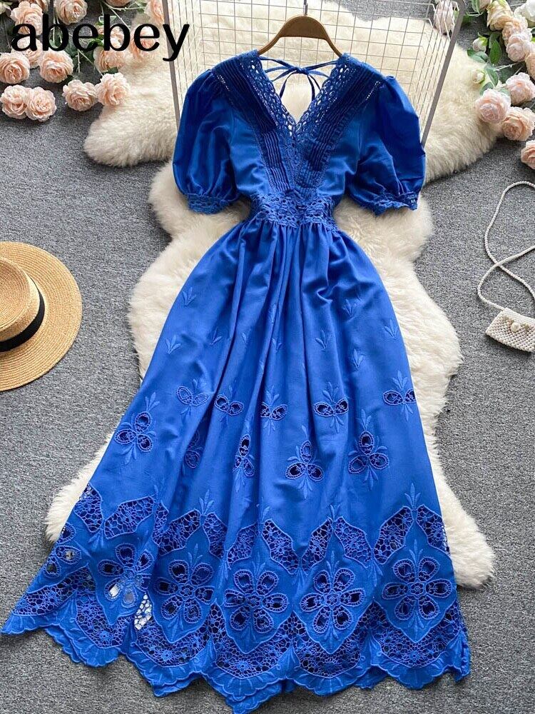 夏のセクシーな中空アウトレースロングドレス女性ピンク/ブルー/ホワイトVネックパフ半袖Aラインパーティーマキシローブ ショート ハーフスリーブ サマー 夏物 Abe35121701081