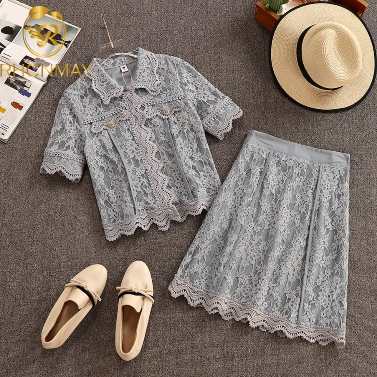 サマーオフィスレディレースツーピースセット女性フローラルかぎ針編みサマーブラウス+ウエストミニスカートセットスウィートシャツスーツ 大人ガーリー キュート カジュアル 夏物 花柄 会社 学校 通勤や通学にも Rhc32450270779